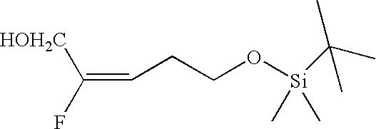 [0732] Example-HH-2) To a solution of Example-HH-1 (6.76 g, 24.5 mmol) in 100 mL of methanol at room temperature was added solid NaBH4 (4.2 g, 220 mmol) in 1.4 g portions over three hours. After 3.5 hours water was added (10 mL). Additional solid NaBH4 (4.2 g, 220 mmol) was added in 1.4 g portions over three hours. The reaction was quenched with 150 mL of sat. aqueous NH4Cl and extracted with diethyl ether (2×250 mL). The organic layers were combined, dried over MgSO4, filtered and concentrated. The crude material, 4.81 g of clear oil, was purified by flash column chromatography on silica gel eluting with 10% ethyl acetate in hexane to give 2.39 g (42%) of the desired (2E)-5-[[(1,1-dimethylethyl)dimethylsilyl]oxy]-2-fluoro-2-penten-1-ol product as a clear oil, that contained an approximate E:Z ratio of 93:7 by19F NMR. [0733] HRMS calcd. for C11H24FO2Si: m/z=235.1530 [M+H]+, found: 235.1536. [0734]1H NMR (CDCl3) δ0.06 (s, 6H), 0.88 (s, 9H), 2.35 (m, 2H), 3.62 (t, 2H), 4.19 (dd, 2H), 5.2 (dt, vinyl, 1H). [0735]19F NMR (CDCl3) δ−120.0 (dt, 0.07F, 7% Z-isomer), −109.82 (q, 0.93 F, J=21 Hz, 93% E-isomer).