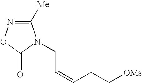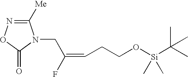 [0736] Example-HH-3) To a mixture of Example-HH-2 (2.25 g, 9.58 mmol), polymer-supported triphenylphosphine (3 mmol/g, 1.86 g, 15 mmol) and 3-methyl-1,2,4-oxadiazolin-5-one (1.25 g, 12.5 mmol) in 60 mL of THF was added dropwise diethylazodicarboxylate (2.35 mL, 14.7 mmol). The reaction mixture was stirred for 1 h at room temperature, and additional 3-methyl-1,2,4-oxadiazolin-5-one (0.30 g, 3.0 mmol) was added. After 30 minutes, the mixture was filtered through celite, and the filtrate was concentrated. The resulting yellow oil was triturated with diethyl ether (30 mL) and the solid removed by filtration. The filtrate was concentrated, triturated with hexane (30 mL) and filtered. The filtrates was concentrated to an oil which was purified by flash column chromatography on silica gel eluting with 15% ethyl acetate in hexane to give 1.83 g (60%) of the desired 4-[(2E )-5-[[(1,1-dimethylethyl)dimethylsilyl]oxy]-2-fluoro-2-pentenyl]-3-methyl-1,2,4-oxadi-azol-5(4H)-one product as a clear oil, that contained only the desired E-isomer by19F NMR. [0737] HRMS calcd. for C14H26FN2O3Si: m/z=317.1697 [M+H]+, found: 317.1699. [0738]1H NMR (CDCl3) δ0.04 (s, 6H), 0.85 (s, 9H), 2.28 (s, 3H), 2.37 (m, 2H), 3.64 (t, 2H), 4.32 (d, 2H), 5.4 (dt, vinyl, 1H). [0739]19F NMR (CDCl3) δ−110.20 (q, 1 F, J=21 Hz).
