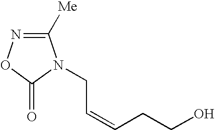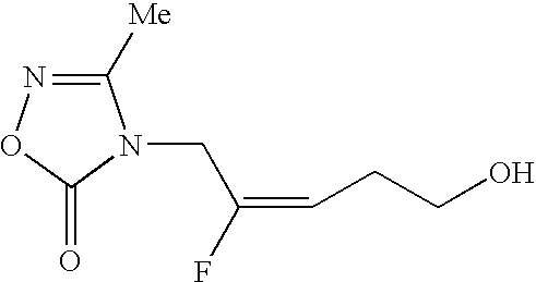 [0740] Example-HH-4) A solution of Example-HH-3 (1.83 g, 5.78 mmol) in a mixture of acetic acid (6 mL), THF (2 mL) and water (2 mL) was stirred at room temperature for 2.5 hours. The resulting solution was concentrated in vacuo to an oil which was dissolved in diethyl ether (50 mL). The organic layer was washed with saturated NaHCO3, and the aqueous layer was extracted with diethyl ether (2×50 mL) and ethyl acetate (2×50 mL). The combined organic layers were dried (MgSO4), filtered and evaporated to give 1.15 g (98%) of the desired 4-[(2E)-2-fluoro-5-hydroxy-2-pentenyl]-3-methyl-1,2,4-oxadiazol-5(4H)-one product as a clear colorless oil. [0741] HRMS calcd. for C8H12FN2O3: m/z=203.0832 [M+H]+, found: 203.0822. [0742]1H NMR (CDCl3) δ2.31 (3H), 2.4 (m, 2H), 3.66 (t, 2H), 4.37 (d, 2H), 5.42 (dt, vinyl, 1H).19F NMR (CDCl3) δ−110.20 (q, 1 F, J=21 Hz).