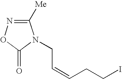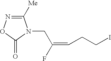 [0743] Example-HH-5) To a CH2Cl2 (2 mL) solution of triphenylphosphine (238 mg, 0.91 mmol) and imidazole (92 mg) at 0° C. was added solid iodine (230 mg, 0.91 mmol), and the mixture was stirred for 5 minutes. To the resulting yellow slurry was added a CH2Cl2 (1.5 mL) solution of Example-HH-4 (0.15 g, 0.74 mmol). The slurry was allowed to warm to room temperature and stirred 30 minutes. The reaction mixture was diluted with CH2Cl2 (10 mL), washed with saturated Na2S2O3 (5 mL) and brine (5 mL), dried (MgSO4), filtered and evaporated to an oil. Addition of diethyl ether (10 mL) to the oil gave a white precipitate that was removed by filtration and the filtrate was concentrated to an oil. The crude material was purified by flash column chromatography on silica gel eluting with 30% ethyl acetate in hexane to give 0.18 g (78%) of the desired 4-[(2E)-2-fluoro-5-iodo-2-pentenyl]-3-methyl-1,2,4-oxadiazol-5(4H)-one product as a clear oil, which solidified upon standing, mp=58.1-58.6° C. [0744] Anal. calcd. for C8H10FIN2O2: C, 30.79; H, 3.23; N, 8.98. Found: C, 30.83; H, 3.11; N, 8.85. HRMS calcd. for C8H11FIN2O2: m/z=330.0115 [M+H]+, found: 330.0104. [0745]1H NMR (CDCl3) δ2.31 (s, 3H), 2.75 (q, 2H), 3.21 (t, 2H), 4.31 (d, 2H), 5.39 (dt, vinyl, 1H).19F NMR (CDCl3) δ−108.21 (q, 1F, J=21 Hz).