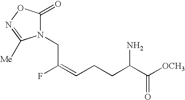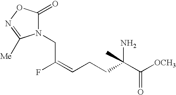 [0292] EX-F-3) To a solution of the product of EX-F-2 (70.0 g, 0.128 mol) in 400 mL of dimethyl formamide at room temperature was added potassium 3-methyl-1,2,4-oxadiazolin-5-onate (28.7 g, 0.192 mol). The reaction was stirred for 2.5 h at room temperature, at which time analysis by thin layer chromatography (30% ethyl acetate in hexane) and LCMS showed that the starting material was consumed. The reaction was diluted with 400 mL of water and extracted with ethyl acetate (5×400 mL). The organic layers were combined, washed with 400 mL water, 400 mL brine, dried over MgSO4, filtered and concentrated. The crude material, 70 g of yellow oil, was purified by flash column chromatography on silica gel eluting with 1:4 ethyl acetate in hexane to give 38 g (63%) of a slightly yellow oil. [0293] EX-F-4) A combination of product of several duplicate preparations of EX-F-3 was purified by HPLC column chromatography on Merk silica gel MODCOL column at a flow of 500 mL/min isocratic at 60:40 MtBE:heptane. A second purification on the 63 g recovered was a chiral HPLC column chromatography on a Chiral Pak-AD column running at a flow of 550 mL/min isocratic at 10:90 A:B (A: 100% ethanol, B: 100% heptane). Fractions containing product were combined and concentrated affording 41 g (68%) of the desired protected L,E-allylic amidine product as a clear oil, that contained only the desired L and E-isomer by19F NMR and chiral chromatography. LCMS: m/z=496.2 [M+Na]+. [M+NH4]+. HRMS calcd. for C21H32FN3O8: 491.2507 [M+NH4]+, found: 491.2517.1H NMR (CDCl3) δ1.48 (s, 18H), 1.85 (m, 1H), 2.2 (m, 3H), 2.25 (s, 3H), 3.64 (s, 3H), 4.25 (m, 2H), 4.8 (m, 1H), 5.3 (dt, 1H, J=20 Hz).19F NMR (CDCl3) δ−110.8 (q, 1F, J=20 Hz).
