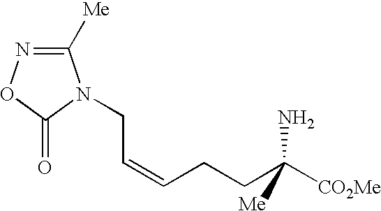 [0241] EX-A-6) To a mixture of EX-A-5 (1.37 g, 3.5 mmol), polymer-supported triphenylphosphine (3 mmol/g, 1.86 g, 5.6 mmol) and 3-methyl-1,2,4-oxadiazolin-5-one (450 mg, 4.55 mmol) in 50 mL of THF was added dropwise dimethylazodicarboxylate (820 mg, 5.6 mmol). The reaction was stirred for 1 h at room temperature, at which time analysis by thin layer chromatography (40% ethyl acetate in hexane) showed that no starting material remained. The mixture was filtered through celite, and the filtrate was concentrated. The resulting yellow oil was partitioned between 30 mL of methylene chloride and 30 mL of water. The organic layer was separated, washed with water (1×30 mL) and brine (1×30 mL), dried over MgSO4, filtered and concentrated. The crude material, 1.8 g of a yellow oil, was purified by flash column chromatography on silica gel eluting with 1:4 ethyl acetate in hexane to give 670 mg (40%) of the desired protected E-allylic amidine product as a clear oil, that contained only the desired E-isomer by19F NMR. LCMS: m/z=496.2 [M+Na]+.1H NMR (CDCl3) δ1.48 (s, 18H), 1.85 (m, 1H), 2.2 (m, 3H), 2.25 (s, 3H), 3.64 (s, 3H), 4.25 (m, 2H), 4.8 (m, 1H), 5.3 (dt, 1H, J=20 Hz).19F NMR (CDCl3) δ−110.8 (q, 1F, J=20 Hz).