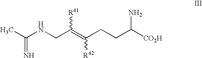 [0103] or a pharmaceutically acceptable salt or prodrug thereof, wherein: [0104] R41 is H or methyl; and [0105] R42 is H or methyl. [0106] Another selective iNOS inhibitor useful in the practice of the present invention is represented by a compound of formula IV