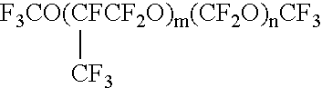 Solvey/Ausimont Fomblin W500 Mixture of: m + n = 8-45, m/n = 20-1,000 and F3CO(CF2CF2O)m(CF2O)nCF3 m + n = 40-180, m/n = 0.5-2.0 Solvey/Ausimont Fomblin M60 F3CO(CF2CF2O)m(CF2O)nCF3 m + n = 40-180, m/n = 0.5-2.0 Dupont Krytox GPL 107 n = 44-45 Dupont Krytox GPL 104 n = 19 Dupont Krytox GPL 103 n = 13-14 Dupont Krytox GPL 105 n = 28 Solvey/Ausimont Fomblin Y06 m + n = 8-45; m/n = 20-1,000 MW = 1,800 Solvey/Ausimont Fomblin M30 F3CO(CF2CF2O)m(CF2O)nCF3 m + n = 40-180; m/n = 0.5-2.0 Solvey/Ausimont Fomblin Y25 m + n = 8-45; m/n = 20-1,000 MW = 3,200 Solvey/Ausimont Fomblin M15 F3CO(CF2CF2O)m(CF2O)nCF3 m + n = 40-180, m/n = 0.5-2.0 Fomblin Y Lubricant Grades Typical Properties Y04 Y06 Y25 Y45 YR YR1500 YR1800 Approximate ISO grade 15 22 100 150 320 460 460 Molecular weight (AMU) 1,500 1,800 3,200 4,100 6,250 6,600 7,250 Kinematic viscosity (ASTM D445) 20° C. (cSt) 38 60 250 470 1200 1500 1850 40° C. (cSt) 15 22 80 147 345 420 510 100° C. (cSt) 3.2 3.9 10 16 33 40 47 Viscosity index (ASTM 60 70 108 117 135 135 135 D2270) Pour point (° C.) (ASTM D97) −58 −50 −35 −30 −25 −25 −20 Evaporation weight loss (ASTM 2595) 120° C., 22 hr (%) 14 6 — — — — — 149° C., 22 hr (%) — 20 2 0.7 0.5 0.3 — 204° C., 22 hr (%) — — 15 1.7 1.2 0.9 0.5 Fomblin Z Lubricant Grades Typical Properties Z03 Z15 Z25 Z60 Approximate ISO grade 15 100 150 320 Molecular weight (AMU) 4000 8000 9,500 13,000 Kinematic viscosity (ASTM D445) 20° C. (cSt) 30 160 263 600 40° C. (cSt) 18 92 157 355 100° C. (cSt) 5.6 28 49 98 Viscosity index (ASTM D2270) 317 334 358 360 Pour point (° C.) (ASTM D97) −90 −80 −75 −63 Evaporation weight loss (ASTM 2595) 149° C., 22 hr (%) 6.0 0.2 — — 204° C., 22 hr (%) n.a. 1.2 0.4 0.2 Fomblin M Lubricant Grades Typical Properties M03 M15 M30 M60 Approximate ISO grade 15 100 150 320 Molecular weight (AMU) 4000 8000 9,800 12,500 Kinematic viscosity (ASTM D445) 20° C. (cSt) 30 150 280 550 40° C. (cSt) 17 85 159 310 100° C. (cSt) 5 22 45 86 Viscosity index (ASTM D2270) 253 286 338 343 Pour point (° C.) (ASTM D97) −85 −75 −65 −60 Evaporation weight loss (ASTM 2595) 149° C., 22 hr (%) 6.5 0.8 — — 204° C., 22 hr (%) — 3.0 0.7 0.4 Solvey/Ausimont Fluorolink S10 (EtO)3Si(CH2)3F2CO(CF2CF2O)m(CF2O)nCF2(CH2)3Si(OEt)3 m = n = 40-180, m/n = 0.5-2.0 Solvey/Ausimont Fluorolink F10 m + n = 40-180; m/n = 0.5-2.0 Solvey/Ausimont Fluorolink D10H HOCH2F2CO(CF2CF2O)m(CF2O)nCF2CH2OH m + n = 40-180; m/n = 0.5-2.0 Solvey/Ausimont Fluorolink T10 m + n = 40-180; m/n = 0.5-2.0 Dupont Krytox Alcohol TLF-8976 n = 10 Dupont Krytox Phosphate KDP-4413 n = 10