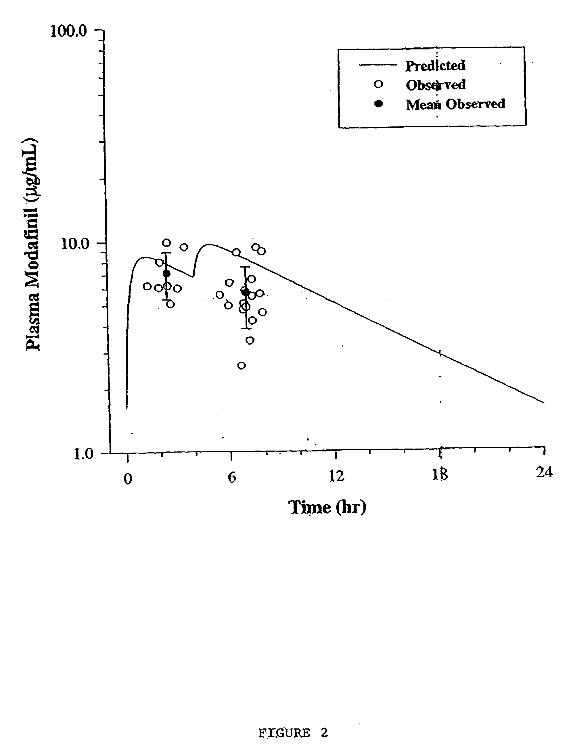 1. A pharmaceutical unit dose consisting essentially of about 250 to about 450 mg of modafinil. 2. A pharmaceutical unit dose consisting essentially of about 250 to about 350 mg of modafinil. 3. The unit dose of 4. The unit dose of 5. The unit dose of 6. The unit dose of 7. The unit dose of 8. The unit dose of 9. The unit dose of 10. The unit dose of 11. A method of treating ADHD in a human subject comprising the step of administering a single dose of about 250 to about 450 mg of modafinil within a 24 hour period to the human subject. 12. A method of treating ADHD in a human subject comprising the step of administering a single dose of about 250 to about 350 mg of modafinil within a 24 hour period to the human subject. 13. The method of 14. The method of 15. The method of 16. The method of 17. The method of 18. A pharmaceutical unit dose of modafinil that, following oral administration to a human, results in a blood profile of modafinil substantially as shown in 19. A method of treating ADHD in a human subject with modafinil, comprising the step of administering to the subject a single dose of modafinil in a 24 hour period that is sufficient to induce a blood profile of modafinil substantially as shown in 20. The unit dose of 21. The unit dose of 22. The unit dose of 23. The unit dose of 24. The unit dose of 25. A pharmaceutical composition comprising about 250 to about 450 mg of modafinil. 26. A pharmaceutical composition comprising about 250 to about 350 mg of modafinil. 27. The composition of 28. The composition of 29. The composition of 30. The composition of 31. The composition of 32. The composition of 33. The composition of 34. The composition of 35. A pharmaceutical composition comprising about 250 to about 450 mg of modafinil that is free of magnesium silicate or talc. 36. The composition of 37. The composition of 38. The composition of 39. The composition of 40. The composition of 41. The unit dose of 42. The composition of 43. The unit dose of 44. The composition of