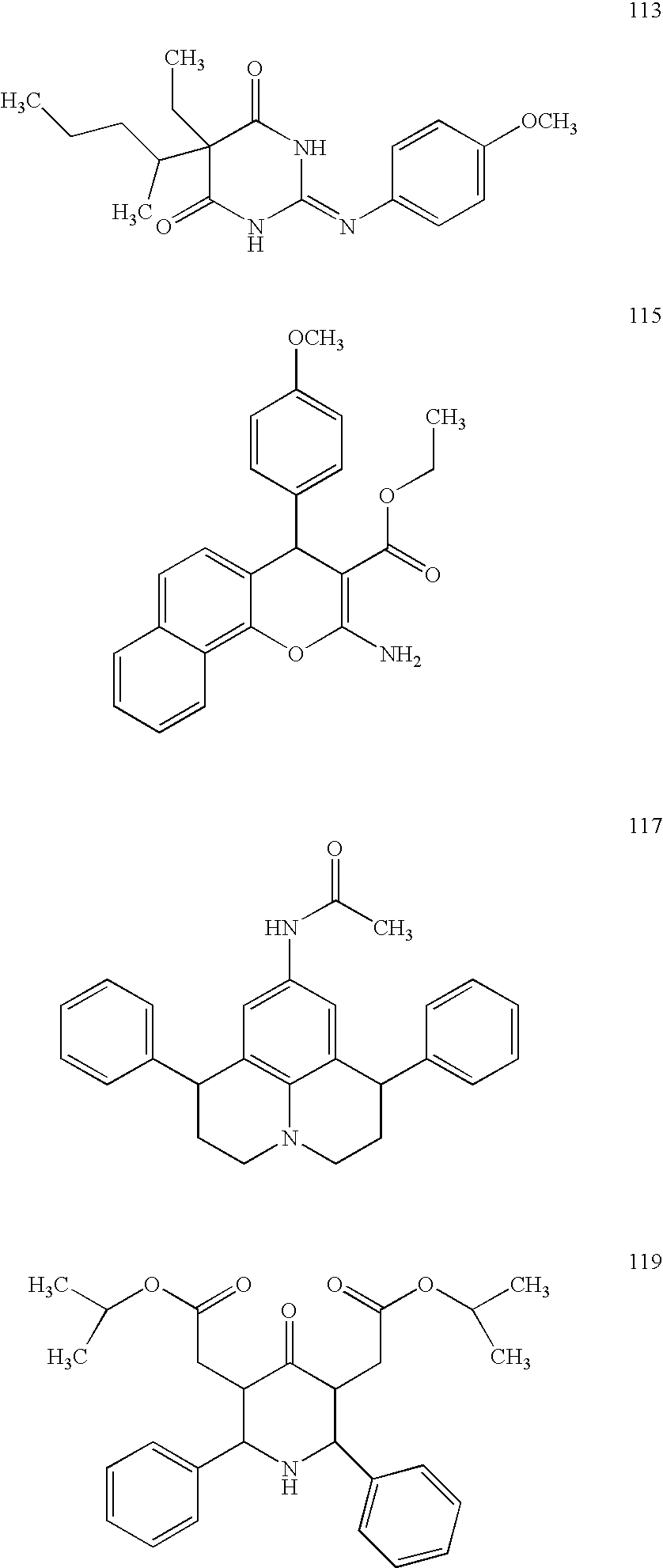 [0082] or a pharmaceutically available solvate or hydrate thereof, wherein; [0083] each of R1, R2 and R3 is independently —H, -halo, —NO2, —CN, —C(R5)3, —(CH2)mOH, —N(R5)(R5), —O(CH2)mR5, —C(O)R5, —C(O)NR5R5, —C(O)NH(CH2)m(R5), —OCF3, -benzyl, —CO2CH(R5)(R5), —(C1-C10)alkyl, —(C2-C10)alkenyl, —(C2-C10)alkynyl, —(C3-C10)cycloalkyl, —(C8-C14)bicycloalkyl, —(C5-C10)cycloalkenyl, —(C5)heteroaryl, —(C6)heteroaryl, —(C5-C10)heteroaryl, -naphthyl, —(C3-C10)heterocycle, —CO2(CH2)mR5, —N(OH)aryl, —NHC(O)R5, —NHC(O)OR5, —NHC(O)NHR5, -heterocylcoalkyl, —C(S)N(R5)(R5), —(C1-C10)alkylNHC(O)(CH2)mR5, —(C1-C10)alkylNR5R5, —OC(O)(CH2)mCHR5R5, —CO2(CH2)mCHR5R5, —OC(O)OR5, —SR5, —S(O)R5, —S(O)2R5, —S(O)2NHR5, or