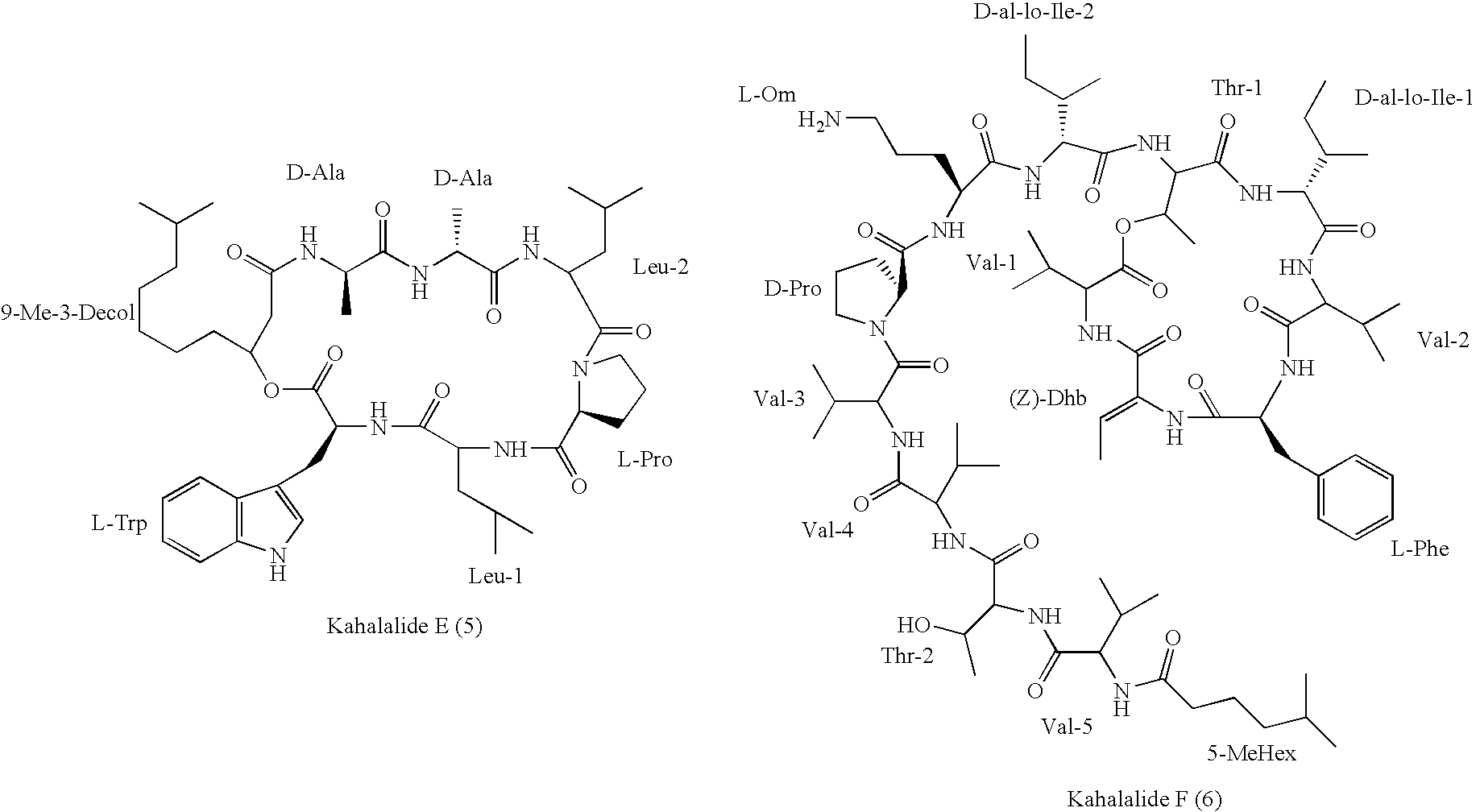 [0009] The cyclic kahalalides have a ring of amino acids, and a side chain which terminates in an acyl group. [0010] Kahalalides have a range of biological activities, notably antitumour and antituberculosis activity. [0011] The present invention provides mimics of natural kahalalides. The compounds may differ in one or more amino acids, and one or more components of the acyl side chain. [0012] Suitably the mimics of this invention have at least one of the following features to differentiate from a parent naturally occurring kahalalide: [0013] 1 to 7, especially 1 to 3, more especially 1 or 2, most especially 1, amino acid which is not the same as an amino acid the parent compound; [0014] 1 to 10, especially 1 to 6, more especially 1 to 3, most especially 1 or 2, additional methylene groups in the side chain acyl group of the parent compound; [0015] 1 to 10, especially 1 to 6, more especially 1 to 3, most especially 1 or 2, methylene groups omitted from the side chain acyl group of the parent compound; [0016] 1 to 6, especially 1 to 3, more especially 1 or 3, substituents added to or omitted from the side chain acyl group of the parent compound. [0017] For cyclic kahalalides, the amino acid addition or omission can be in the cyclic ring or in the side chain. [0018] Examples of this invention are compounds related to kahalalide F, and having the formula: