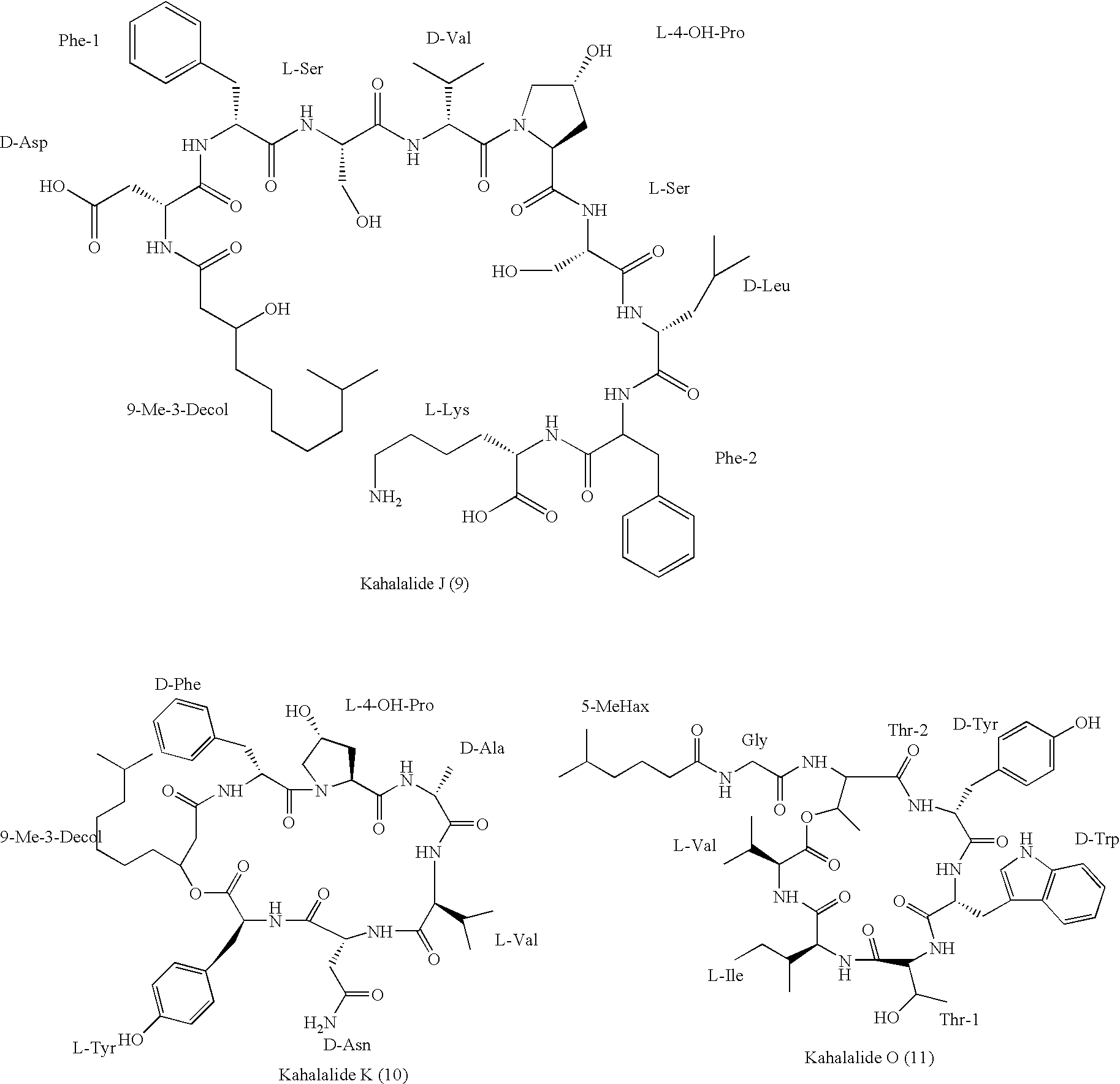 [0005] It is now accepted, and demonstrated again in this text, that the correct formula for kahalalide F is the formula (I). [0006] The structure is complex, comprising six amino acids as a cyclic part, and an exocyclic chain of seven amino acids with a terminal acyl group. Kahalalide F (I) is an exceedingly potent and rare marine-derived antitumour agent, though the absence of adequate quantities has slowed plans for clinical trials. [0007] Other kahalalide compounds are known, and for example we refer to Hamann, M. T., et al., [0008] The structures for these further kahalalide compounds are shown in the following formulae: