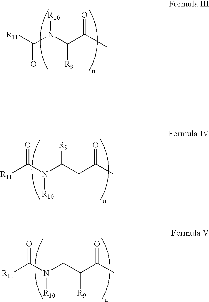 [0019] wherein Aaa1, Aaa2, Aaa3, Aaa4, Aaa6, and Aaa7 are independently α-amino acids of L or D configuration, if applies; wherein R1, R2, R3, R4, R5, R6, R7 are each independently H or an organic group selected from the group consisting of an alkyl group, an aryl group, an aralkyl group, and their substituted derivatives with an hydroxy group, a mercapto group, an amino group, a guanidino group, a halogen group; wherein X1 is independently O, S, or N; wherein R2 is, if applies, independently H or an organic group selected from the group consisting of an alkyl group and an aralkyl group; wherein Aaa5 is independently an amino acid of L or D configuration, if applies; wherein X2 is independently an organic group selected from the group consisting of an alkenyl, an alkyl group, an aryl group, an aralkyl group, and their substituted derivatives with an hydroxy group, a mercapto independently H or an organic group selected from the group consisting of an alkyl group, an aryl group, an aralkyl group, and their substituted derivatives with an hydroxy group, a mercapto group, an amino group, a guanidino group, a halogen group; wherein R8 is independently of the following formulae III, IV, or V: