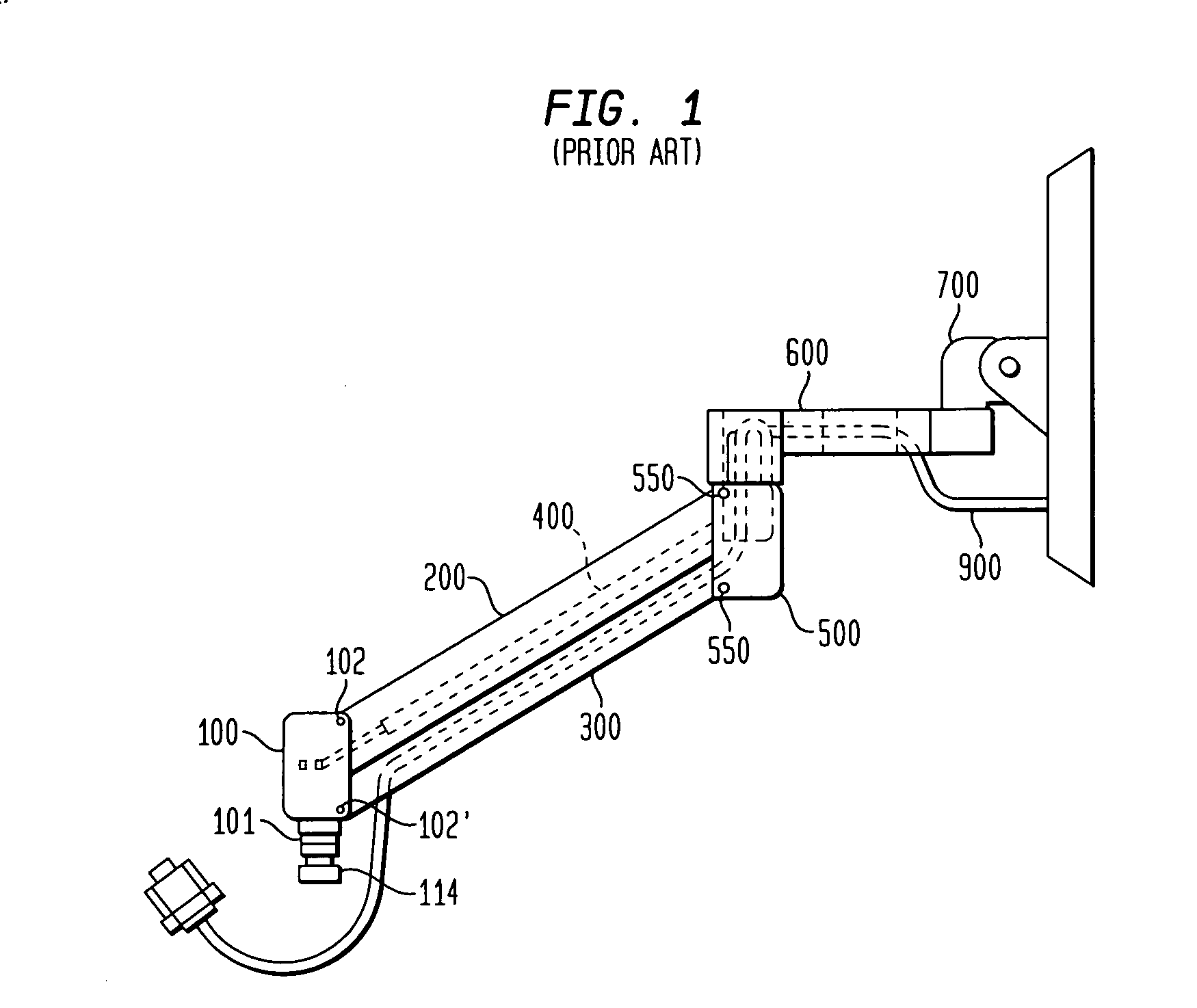 [0001] The present application is a continuation-in-part of application Ser. No. 10/061,880 entitled “Modular Mounting Arm”, filed Feb. 1, 2002, the disclosure of which is incorporated herein by reference. [0002] This invention relates in general to an apparatus for mounting devices, and more specifically, to a modular forearm extension for mounting electronic peripheral devices in a statically balanced adjustable position. [0003] Articulated extension arms for mounting electronic peripheral devices, such as computer monitors, notebook computers, internet computers, video cassette recorders, cameras, computer keyboards, televisions, and the like are well known in prior art. For example, there is known from O'Neill, U.S. Pat. No. 4,852,842; Greene, U.S. Pat. No. 5,584,596; and Voeller et al., U.S. Pat. No. 5,743,503 various mechanical support arms. [0004] Due to recent advances in flat-screen technology, there is a demand for adjustable extension arms particularly suited for use with flat-screen devices, such as flat-screen computer monitors and televisions. One such example is described in Applicant's U.S. Pat. No. 6,478,274 entitled “Arm Apparatus For Mounting Electronic Devices.” Another example is described in Applicant's U.S. Pat. No. 6,409,134 entitled “Arm Apparatus for Mounting Electronic Devices with Cable Management System.” The disclosures of these applications are incorporated herein by reference. [0005] [0006] The first endcap 100 has an endcap shaft 101 that may contain a plurality of concentric circumferential grooves 114. The endcap shaft 101 may be pivotably attached to a rigid support mount (not shown), such as an orifice sized to accept the endcap shaft 101 or a track configured and sized to slidably engage the grooves 114 provided, or both. [0007] The first endcap 100 contains two pairs of holes 113 (See [0008] The combination of the upper and lower channels 200, 300 and the first and second endcaps 100, 500 form an adjustable parallelogram that permits a device coupled to the forearm extension 600 to be raised and lowered to a desirable height. The parallelogram retains its position by employing a suspension device 400, which is pivotally and adjustably attached to the first endcap 100 and the upper channel 200, as will be further described below. Generally, the suspension device 400 is sized so as to have a fixed length until an upward or downward force is exerted at the second endcap 500 that exceeds the suspension device's designed resistance. One suitable suspension device 400 is a gas filled piston known for this purpose and commercially available from a variety of manufacturers. Typically, such a gas filled piston will have an adjustable resistance with a range suitable for use in accordance with the weight of the electronic peripheral device specified. Thus, the suspension device 400 causes the parallelogram to retain its position when the only force exerted at the second endcap 500 is the weight of the device, but permits the parallelogram to be adjusted when a user pushes the electronic peripheral device up or down. [0009] A first female coupling 602 couples the second endcap 500 to the forearm extension 600 while a second female coupling 603 couples the opposite end of the forearm extension 600 to the mounting device, such as the tilter 700. Thereafter, the mounting device may be coupled to the electrical peripheral device. The electrical peripheral device may in turn have a cable 900 of sufficient length and diameter as to permit its placement through the forearm extension 600, second endcap 500, and lower channel 300, so as not to be visible in those areas. [0010] [0011] In accordance with the preferred embodiment as shown in [0012] The stops 153 serve to provide limits of upward or downward movement of the upper channel 200 and lower channel 300 when the ends of the upper channel 200 and lower channel 300, respectively, meet the stops 153 when one moves the electronic peripheral device in extended or contracted positions. The trough 159 disposed between the trough walls 158 allows a clevis 120 to be moved therein. As discussed in more detail later, the clevis provides connection and adjustment means for one end of the suspension device 400. [0013] [0014] The threaded rod 107 is employed within the first endcap 100 so as to adjustably support the clevis 120. [0015] The first end 108 of the threaded rod 107 is disposed in the groove 161 located between the shelves 160 of the first endcap 100 (See [0016] Between the first end 108 and the second end 109 of the threaded rod 107 is a threaded section 167. Threadably mounted on the threaded section 167 is the clevis 120. The clevis 120 as illustrated in [0017] The second end 109 of the threaded rod 107 can be engaged by a shaped key to rotate the threaded rod 107 around its axial centerline. When the threaded rod 107 is rotated around this axis of rotation, the clevis 120 travels along the length of the threaded rod 107 in a direction corresponding to the direction which the shaped key is turned. This movement of the clevis 120 adjusts the length of the suspension device 400 thereby altering its resistance. [0018] [0019] Cast molded upper channels 200 permit the angle between the channel bottom 203 and the channel sidewalls 204 to be exactly the same for each manufactured upper channel 200. Moreover, cast molding permits the sidewalls 204 to be tapered. As illustrated in FIGS. 4( [0020] The rollers 202 have a hole 205 therethrough (either cast in or subsequently drilled) for receiving a connection mechanism, such as pins 102, 550. Additionally, the channel bottom 203 includes an integrally cast threaded hole configured and sized to receive a threaded end ball stud 207. The ball stud is configured and sized to receive a second end of the suspension device 400. [0021] [0022] The channel bottom 303 additionally includes a cable channel 306 running longitudinally there along. Typically, a first end 307 o