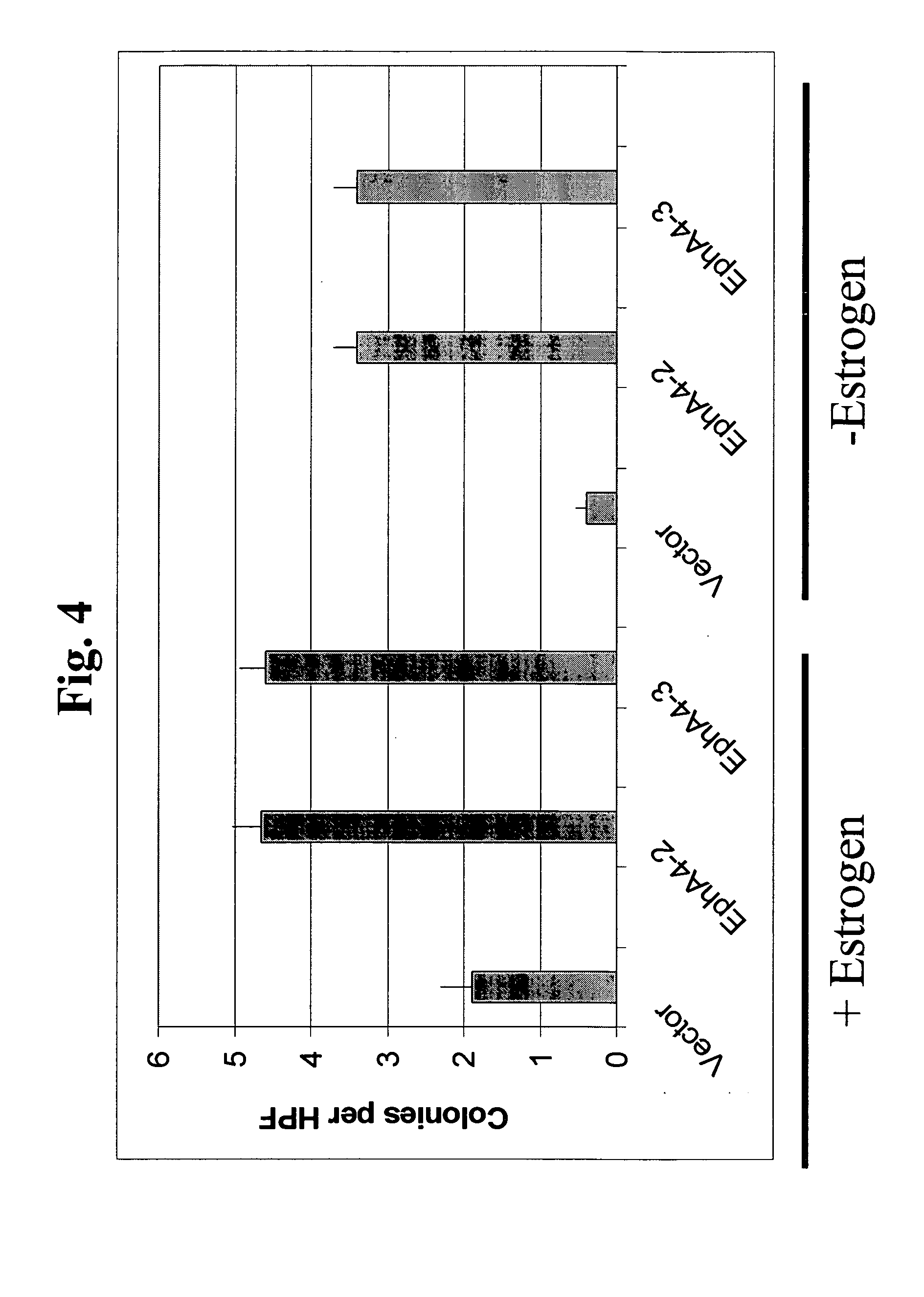 In another line of experiments, EphA4 upregulation promotes anchorage-independent growth of MCF-7 mammary carcinoma cell line to be less dependent on estrogen for growth. MCF-7 cells, which normally express very low levels of EphA4, were transfected, and stable expressors of EphA4 were isolated (EphA4-2 and EphA4-3). During soft agar assays with estrogen, MCF-7-EphA4 cells demonstrated a 2.4 fold increase in anchorage independent growth compared to a vector-transfected control (FIG. 4). However in the absence of estrogen, EphA4-expressing cells had a 8.5 fold increase in growth compared to the same controls. These data suggest that EphA4-overexpressing cells are less dependent on growth cues (such as matrix attachment and growth factors) than cells without EphA4. The results of these experiments also suggest that antibody-mediated aggregation of MCF-7-EphA4 cells can reverse the increase in malignant potential.