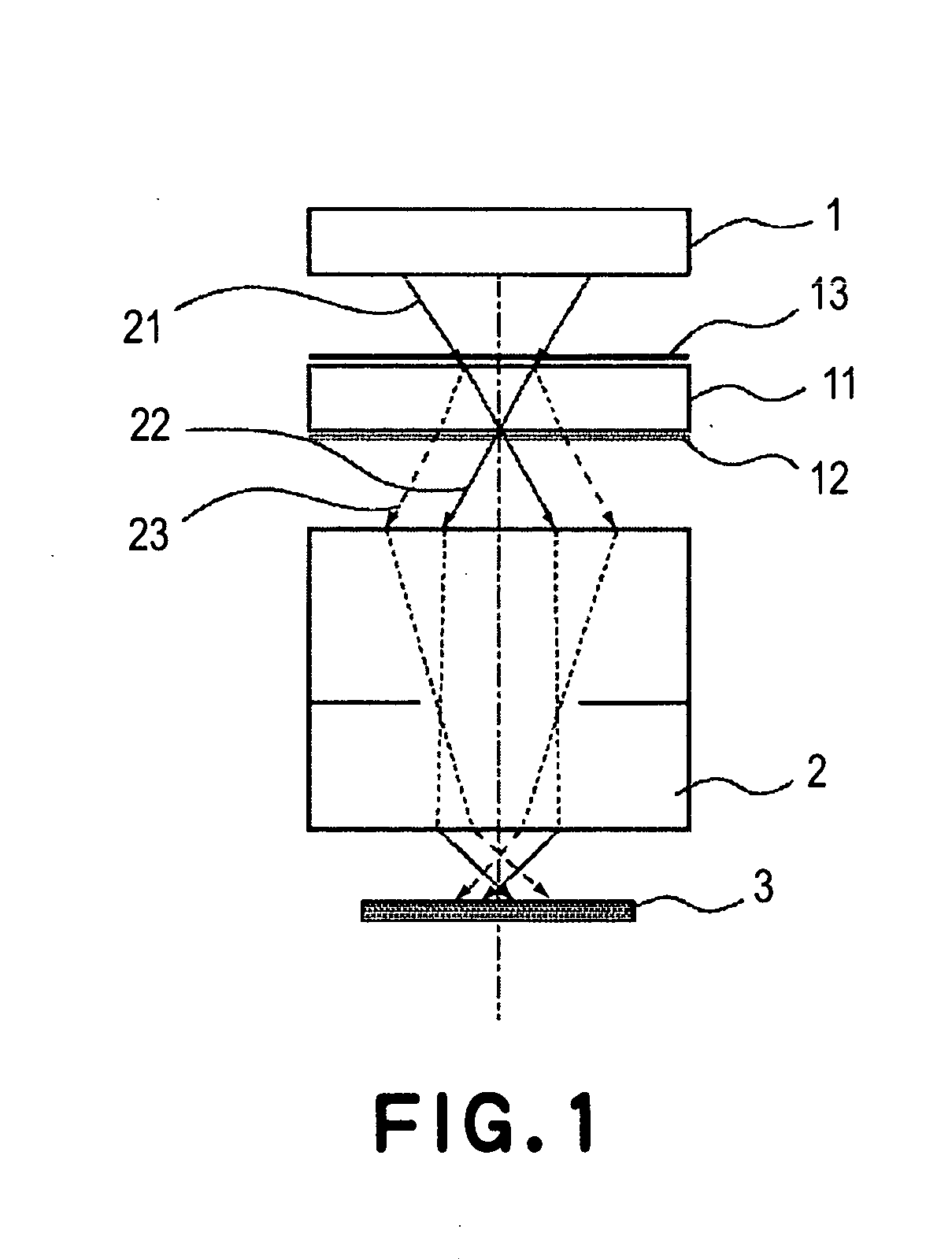These and other objects, features and advantages of the present invention will become more apparent upon a consideration of the following description of the preferred embodiments of the present invention taken in conjunction with the accompanying drawings. Preferred embodiments of the present invention will now be described with reference to the attached drawings. In the drawings, like numerals are assigned to corresponding elements, and duplicate description are omitted. Referring to In In accordance with this embodiment, an anti-reflection film 13 is provided at the back surface of the reticle 11, that is, on the surface remote from the reticle 11 surface where the circuit pattern 12 is formed (see The effect of such anti-reflection film 13 will be explained in terms of Gaussian intensity distribution ( On the other hand, the curve denoted at 33 is an intensity distribution in a case where there is stray light of 5% to light 22. If the width of the curve at the slice level (exposure amount) 50%, as determined by the region where flare is small, is the region to be patterned by the exposure, the exposure linewidth of the curve 32 becomes larger by about 7.5% as compared with the curve 32. Namely, it is seen that, as compared with a case wherein the exposure amount is determined on the basis of a region having small stray light, the linewidth in the region having stray light grows by about 1.5% per 1% of stray light. This means that the linewidth becomes larger by 1.5% from what has been aimed at. The anti-reflection film is not limited to a monolayer film. A multilayered film, for example, may be used, and the reflectance can be lowered more in that occasion. The advantageous effects as described above can be extended. Further, while the exposure wavelength is 248 nm in the above-described example, a different wavelength such as 157 nm or 134 nm may be used. This embodiment is effective also in regard to a case wherein reflection light at a light blocking portion provided at the outer periphery of a device region of a reticle, where a circuit pattern is formed, produces an adverse influence to a region outside the device region. This will be explained below, in conjunction with Usually, while taking into account the light shielding of an illumination region, a reticle is provided with a light blocking zone 14 at the outer periphery of the reticle pattern region. The width thereof is 1.5 mm, for example. Where the NA is small (NA=sin θc), illumination light 21 The illumination light as reflected plural times between the light blocking zone 14 and the reticle back surface may advance toward the wafer side. In such case, however, it would be easily expected that the intensity is very low so that it does not have an influence to the exposure. If, on the other hand, the NA is large (NA=sined) and illumination light 21 It may be possible to make the light blocking zone larger as the exposure NA becomes large. However, usually, at an area on the reticle which is outside the device region, namely, outside the light blocking zone, there are marks provided for alignment operation. If the light blocking zone becomes larger, these alignment marks have to be placed outwardly. Since the alignment marks should be projected onto a wafer through a projection optical system, this necessitates enlargement of the effective region of the projection optical system. However, because it requires extension of the performance assured region of the projection optical system, production difficulties are much raised on one hand and the size is enlarged on the other hand. In consideration of this, the light blocking region should be kept small. Now, the relationship between the range of influence of reflection light due to enlargement of the NA and the width of the light blocking zone, will be considered. If the refractive index of a medium before incidence of light upon the reticle is n1, the refractive index of the reticle is n2, the thickness of the reticle is t, the width of the light blocking zone is d, and the incidence angle of light is θ (it is θc if NA is low, and θd if NA is high), the condition for that the light goes beyond the width of the light blocking zone and leaks to the outside of the device region can be given by: