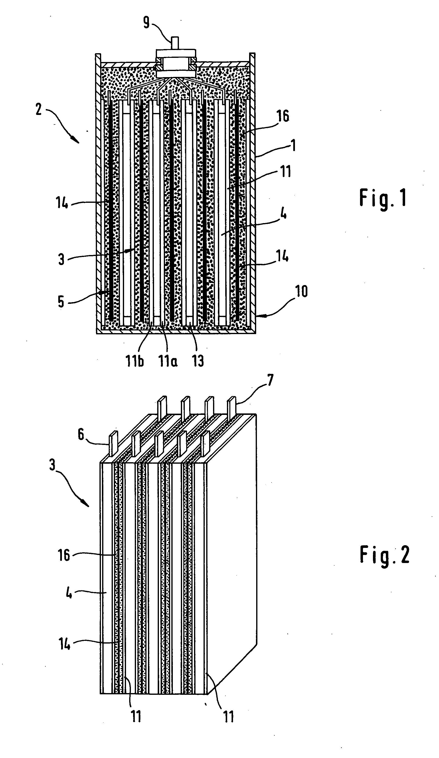 Of course, the described methods can be used in combination with one another in order to achieve an especially high volume filling proportion. The structure-forming solid particles are preferably made of a material which is inert in relation to the electrolyte, its overcharge products, and the active mass. For example, ceramic powders, and in some circumstances particles made of amorphous materials, particularly glasses, are suitable, while tonically disassociating materials (salts) should not be used for the structure-forming components. In any case, the material of the structure-forming solid particles should have a sufficiently high melting point of at least 200° C., preferably at least 400° C. Compounds which do not contain oxygen, in particular carbides, nitrides, or phosphides, are especially suitable from a safety viewpoint. Carbides, nitrides, or phosphides of the fourth main group of the periodic system, in particular of silicon, have proven to be especially suitable. Silicon carbide is especially suitable because of its good availability and its high thermal conductivity. In general, compounds having a high thermal conductivity of at least 5 W/mK, preferably at least 20 W/mK are preferred. In specific cases, the use of oxygen-containing compounds may also be advantageous. This is in particular true for SiO2, which is available cost-effectively, also in spherical shape. The present invention will be explained in greater detail hereafter on the basis of exemplary embodiments illustrated in the figures. The features described therein may be used individually or in combination to provide preferred embodiments of the present invention. In the figures The housing 1 of the battery 2 illustrated in The electrodes 4,5 are shaped in the usual manner as sheets, i.e. as layers having a low thickness in relation to their area dimension. They are separated from each other by separators 11. In the preferred embodiment shown, the positive electrodes are covered on both sides by two layers 11 The positive electrodes are preferably composed of an intercalation compound of a metal oxide, e.g. lithium cobalt oxide in the case of a lithium cell. The negative electrodes each have an electronically conductive substrate 14 as a current collector element, on which an active mass is electrolytically deposited during charging of the cell. The substrate 14 is very thin in comparison to the positive electrode 4 and is therefore shown as a dark line only. In practice it is preferably made of a porous metal structure, e.g. in the form of a perforated plate, lattice, metal foam, or expanded metal. A porous structure 16 made of solid particles 17, which is more clearly recognizable in The porous structure 16 is formed and positioned in such a manner that no accumulations of the active mass 15 can form in cavities which are significantly larger than the pores of the porous structure. The porous structure 16 does not form a composite with either the substrate 14 or the separator 11 in such a manner that the layers adhere to one another (without the effect of external forces). Therefore cavities can exist or arise during operation of the cell between the substrate 14 and the porous structure 16, between the porous structure 16 and the separator 11, and within the porous structure 16 itself. In order to avoid formation of such cavities, the intermediate space 21 between the substrate 14 and the separator 11 should be filled up so completely that no cavities remain which are significantly larger than the pores of the porous structure and in which accumulations of the active mass deposited during the charging process could form. The porous structure can be manufactured by pouring the solid particles into the cell as a dry, pourable powder. The solid particles may then be compacted by striking, shaking, or stamping in order to achieve the desired volume filling proportion. Although it is in principle sufficient to fill the intermediate space 21 between the substrate 14 and the separator 11, it is advantageous in practice if all cavities existing in the cell are filled. For this reason, in the cell illustrated in In order to ensure a sufficient layer thickness of the porous structure 16, spacers, e.g. in the form of plastic strips, may be used, which a define a distance between the substrate layers 14 and the separator layers 11 before the pouring. The spacers may be removed after a first partial quantity of the solid particles is poured in, but a design in which spacer elements (e.g., fiberglass lattices) remain in the cell is also possible. According to an alternative method of introducing the porous structure 16 into the cell, a suspension of the solid particles 17 in a volatile liquid is first poured into the cell and the liquid is thereafter removed (using vacuum and/or elevated temperature). According to a further method variation, the solid particles 17 can be processed using a binder material, such as methylcellulose, with the addition of a liquid, into a pasty mass. This pasty mass can be placed between the substrate 14 and the separator 11 during the assembling of the electrode arrangement 3 outside the cell housing. The binder can be removed from the layer, for example by heating. In contrast to a binder which remains in the cell, this binder does not have to be inert. Of course, more than two fractions can also be used, for example in such a manner that the particles of a medium fraction fit into the spaces between the particles of a coarsest fraction and the particles of the finest fraction fit into the spaces of the medium fraction. In practice the particle size is selected by screening. The particle size is therefore defined by the hole size of the screen used. The average particle size is defined by the average of the size distribution curve of the fraction. An especially preferred embodiment in which the porous structure 16 contains a solid salt 26 is illustrated in In general, the average particle 