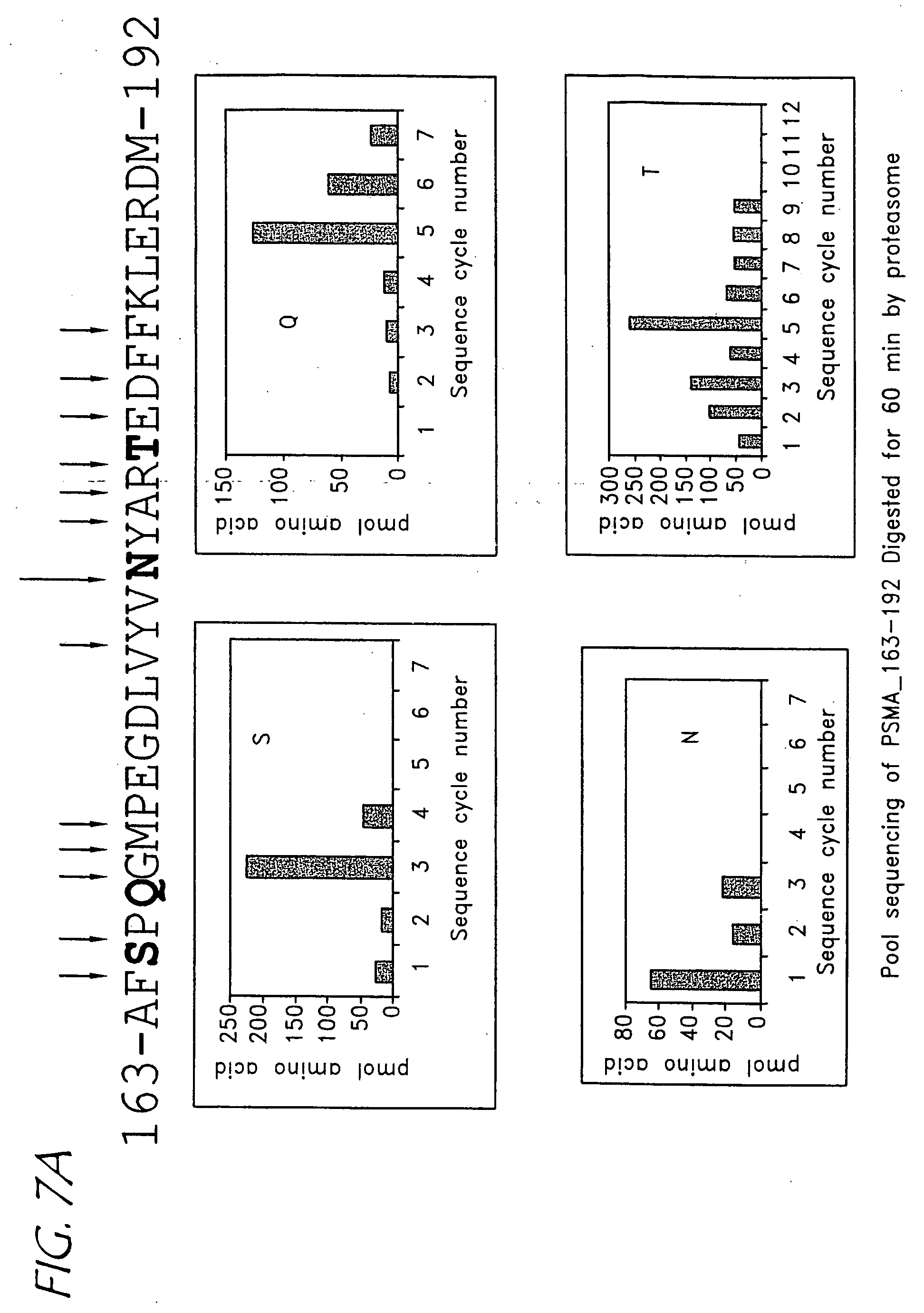 One aliquot at one hour of the proteasomal digestion (see Example 3 part 3 above) was subjected to N-terminal amino acid sequence analysis by an ABI 473A Protein Sequencer (Applied Biosystems, Foster City, Calif.). Determination of the sites and efficiencies of cleavage was based on consideration of the sequence cycle, the repetitive yield of the protein sequencer, and the relative yields of amino acids unique in the analyzed sequence. That is if the unique (in the analyzed sequence) residue X appears only in the nth cycle a cleavage site exists n−1 residues before it in the N-terminal direction. In addition to helping resolve any ambiguity in the assignment of mass to sequences, these data also provide a more reliable indication of the relative yield of the various fragments than does mass spectrometry. For PSMA163-192 (SEQ ID NO. 30) this pool sequencing supports a single major cleavage site after V177 and several minor cleavage sites, particularly one after Y179. Reviewing the results presented in FIGS. 7A-C reveals the following: