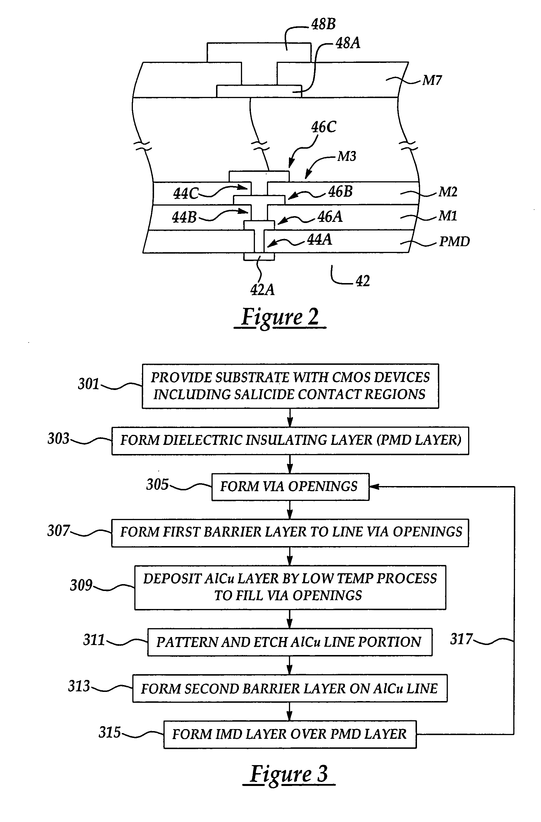 a) a dielectric insulating layer over a conductive portion; b) an AlCu via comprising a barrier layer formed in the first dielectric insulating layer in closed communication with the conductive portion; wherein structure portions a) through b) are stacked sequentially to comprise at least three metallization layers. 36. The multi-level wiring interconnect structure of 37. The multi-level wiring interconnect structure of 38. The multi-level wiring interconnect structure of 39. The multi-level wiring interconnect structure of 40. The multi-level wiring interconnect structure of 41. The multi-level wiring interconnect structure of 42. The multi-level wiring interconnect structure of 43. The multi-level wiring interconnect structure of 44. The multi-level wiring interconnect structure of