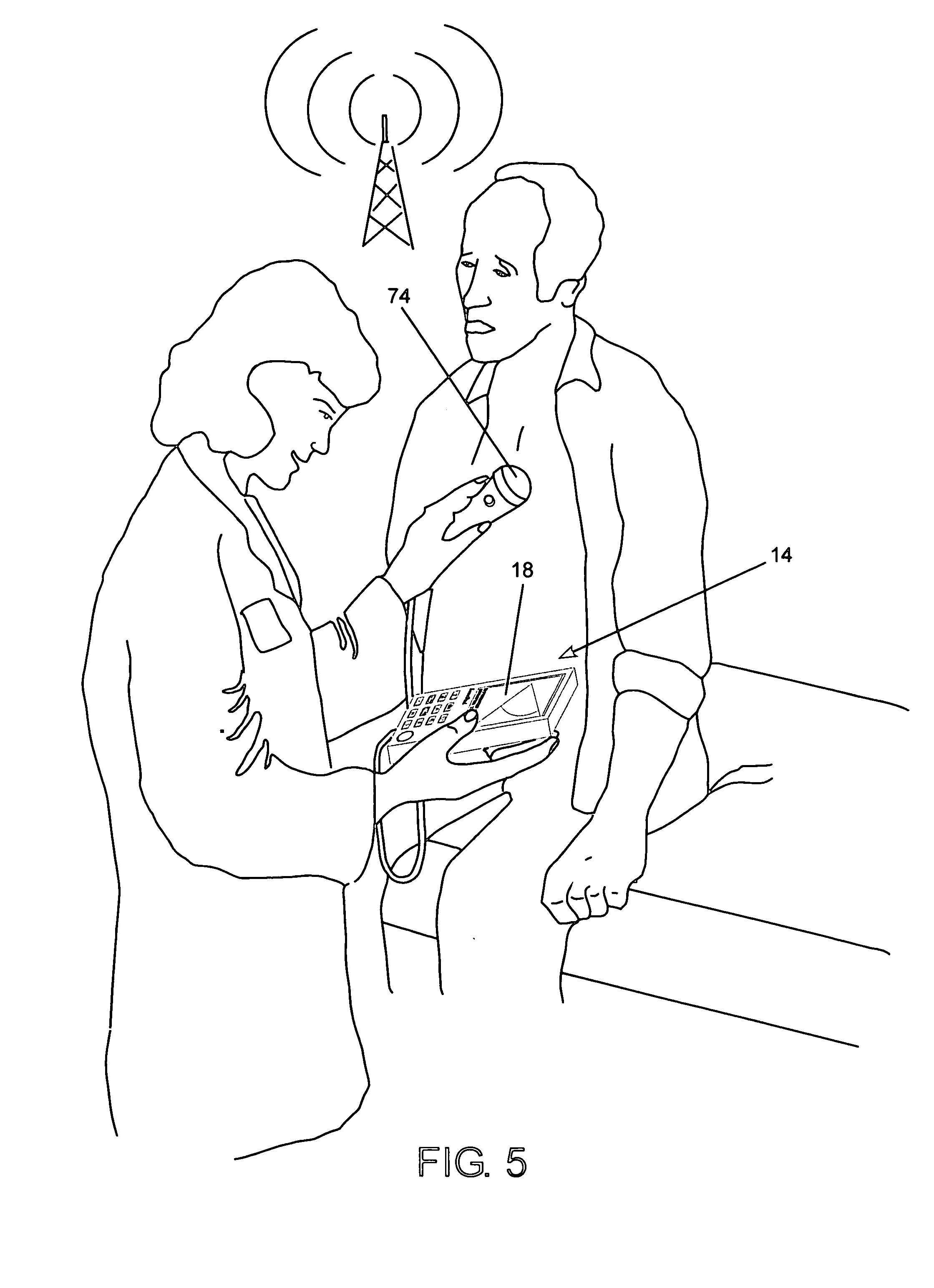 If the on key 32 is held down over three seconds, the diagnostic ultrasound device 14 will turn “OFF”. When the setup menu is displayed, the bottom row of keys allows previous key 33, select key 34 and next key 35 of a menu item for all menu selections. If a menu item has additional selections, the bottom row of keys will again be used to move to and select the menu item. The text key 36 allows numbers and text to be placed on the screen. When text key 36 is depressed, the diagnostic ultrasound device 14 freezes the current image and enters text mode. A flashing cursor line will first appear and may be moved by the trackball 22 device to the location of desired text. If an alphanumeric key is pressed quickly, it is the key number; if a alphanumeric key is pressed again, first letter of the series of associated letters is displayed; if a alphanumeric key is pressed again, the second letter of the series of associated letters is displayed; if the alphanumeric key is pressed again, the third letter of the series of associated letters is displayed. The alphanumeric selection will be completed when the text key 36 is depressed. If in text mode the erase key is pressed, the alphanumeric letters and numbers will be erased similar to a backspace key until the erase key is released. If the erase key is held down over three seconds, all text will be erased and the diagnostic ultrasound device 14 will return to normal active imaging mode. At all times, once a mode is to be exited, a three second key press of the associated function key will return the diagnostic ultrasound device 14 to active scanning mode and clear all menus. For calipers, when the caliper key 37 is depressed the image is frozen. An “X” is displayed and moved to the required measurement position by the trackball 22. When the caliper key 37 is again depressed, the first caliper measurement point is marked and a second “X” is displayed. The trackball 22 device moves the second “X” until at the desired end of measurement position and the caliper key 37 is depressed again. The display is updated to show the distance in millimeters and displays the selected pre-programmed conversion table. If the caliper key 37 is pressed again, a “+ ” appears and follows in similar manner as the first caliper measurement. When the caliper key 37 is held down for three seconds, all calipers are cleared and the active display is restored. For area, when the area key 38 is depressed the image is frozen. An “X” is displayed and moved to the required perimeter position by the trackball 22. When the area key 38 is depressed again, pixels will be turned full grey scale around the boundary traced by the trackball 22. When the trackball 22 device closes the perimeter of the object boundary, depressing the area key 38 again will display the area of circumference and perimeter distance measured, along with the selected pre-programmed conversion tables. Holding down the area key 38 for three seconds will restore the active image. For zoom, when the zoom key 39 is pressed the image is frozen. A “zoom” box of 120×120 pixels is displayed. This zoom box is under trackball 22 device control so the user can move the box to the region of interest. When the zoom key 39 is again depressed, the selected area will be displayed full screen and become active again. When the zoom key 39 is depressed for three seconds the full 304×240 pixel ultrasound image will be restored and active. When the store key 40 is depressed, any active or frozen image will be stored. If the image is in text, area or caliper mode, the measurements will be stored in the image file. If a user goes to store an image or sequence and there is not enough memory, a “Card Full” message will be displayed. If the store key 40 is pressed and the error “Card Full” is displayed, the user will be asked to clear one image or clear all images. If one image is to be cleared, it must be recalled and selected. When it is selected, the erase key will clear that image. If all images are to be cleared, the user must confirm by selecting “YES” or “NO”. In all cases, if the card is write protected, no images will be deleted. A sequence of 64 images or “Cineloop™” will always write over the existing 64 images with a new sequence. One 64-image sequence is the maximum allowed on any card at one time; which is about two seconds of real time ultrasound. All images are stored in QVGA resolution to the secure digital device. Images are acquired and stored in this compact format; however they are expanded or scaled to VGA for display purposes. When the recall key 41 is depressed, a list of images will be displayed to the screen and the select key 34 may select the image. If the recall key 41 is depressed again, the images will appear in “round-robin” fashion for each press of the recall key 41. When in recall mode, a special Cineloop™ Icon will be shown in the first image position. If this Cineloop™ Icon is selected and the select key 34 depressed, the last 64 images are recalled in a play back loop, similar in function to a VCR recording device. If the Cineloop™ Icon is recalled and the erased, the diagnostic ultrasound device 14 can store a new set of 64 images in rapid selection for playback. These JPEG or DICOM™ images are stored on the secure digital flash device; a typical device would be a secure digital card as offered by Sandisk™ and others. The freeze key 42 pauses the active image for all modes of use of the diagnostic ultrasound device 14. This key function is also available directly on most probes as single button on the probe body. When the diagnostic ultrasound device 14 is operating in any active imaging mode, the previous key 33, select key 34 and next key 35 are used to move to and select the NEAR, FAR and TGC gain adjustment. When the required gain is selected, the previous key 33 and next key 35 will decrement or increment the selected gain. This