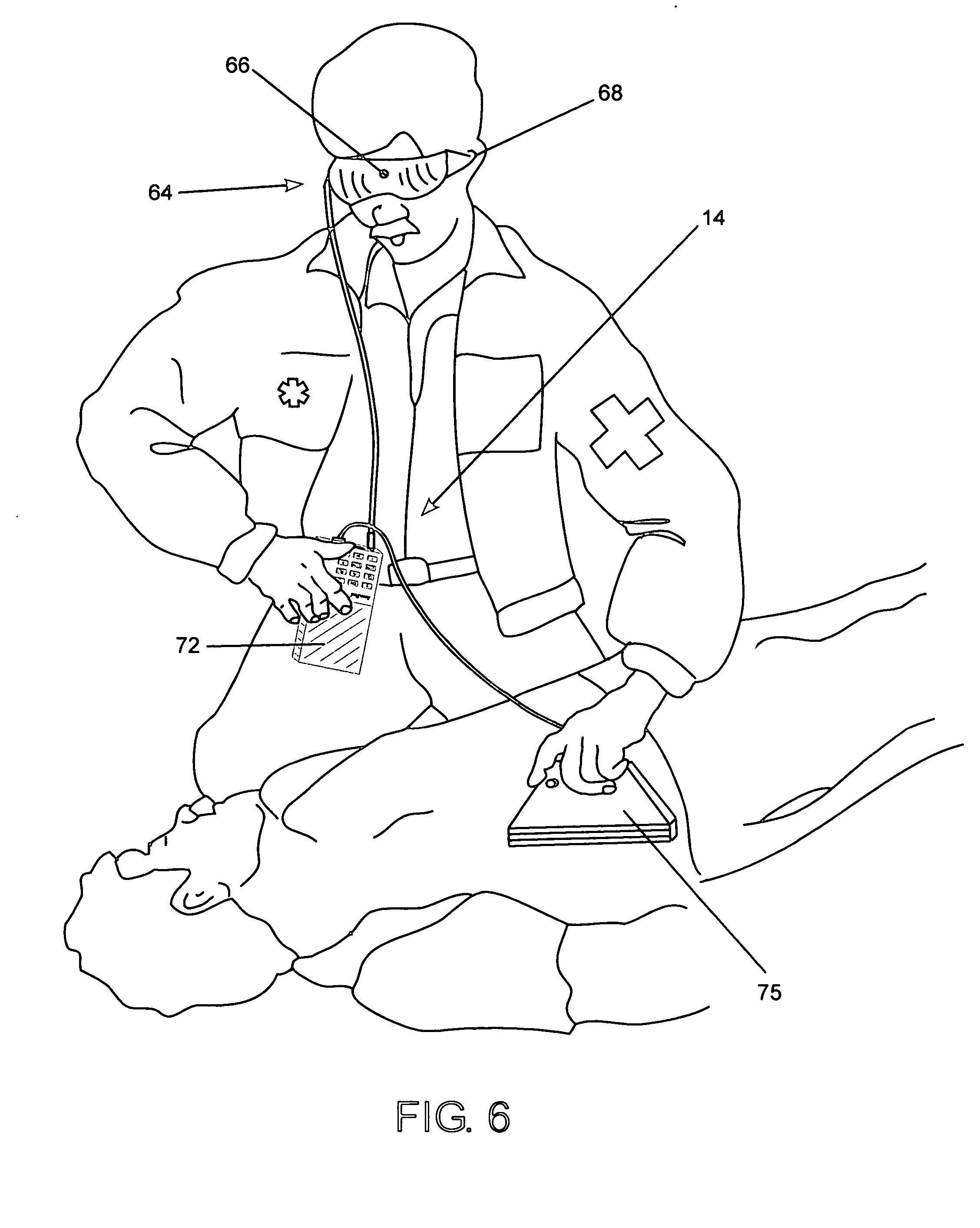 The VGA display is protected by a clear protective surface, polarized to minimize sunlight reflection and optically coated to enhance brightness and contrast. The optical enhancement process allows maximum lumen output while keeping the CCFL or LED 24 backlight to a minimum setting to preserve power. A keypad 20 is provided for all user entry and control of the diagnostic ultrasound device 14. The keypad 20 is constructed such that it may be backlit for handheld use in adverse lighting conditions. The keypad 20 is designed to be cleaned with common anti-bacterial and anti-fungal cleaning agents such as Novasan. A trackball 22 device is provided for caliper measurements, area measurements zoom box positioning and Doppler area of interest. This trackball 22 device has a scraper ring (not shown) that keeps the ball (not shown) free of contaminants. The ring and ball may be removed from the front of the diagnostic ultrasound device 14 for cleaning. The trackball 22 device allows an operator to position a cursor without looking at the diagnostic ultrasound device 14 itself when using the head_mounted display. The diagnostic ultrasound device 14 provides a led 24 and an audible alarm (not shown). The audible alarm provides tactile feedback of the keypad 20 and system low battery indication. The led 24 can be blue, green or orange. When the ultrasound device is “ON”, the led 24 is illuminated blue. If the battery is low, the led 24 is illuminated orange. When the battery pack is charging, the led 24 pulses orange until the battery pack (not shown) is charged, then the led 24 is illuminated green, indicating a full charge. The diagnostic ultrasound device 14 must be “OFF” to allow the battery pack to be charged. The HMD, herein below described, displays the battery status, which shows the operator how much electric charge, remains. When the battery pack is depleted to 10% of its nominal capacity, the audible alarm, if enabled in the setup menu, periodically beeps, to let the user know the battery is low. This beep is also heard in the ear-speaker, herein below described. A removable secure digital flash card 26 is the only non-volatile image storage on the handheld diagnostic ultrasound device 14. When an image is recalled for display, it is de-compressed and displayed on the HMD and/or LCD Display 18. Each single image has a five second audio tag stored on the card as well. If the audio tagging is turned “ON” in the setup menu, the individual images can be stored at a five second rate, whereas a 64 sequence image (Cineloop™) is stored at the frame rate of 30 frames per second. The numbers given for storage are typical, but it should be understood that the secure digital flash card 26 memory is dynamically allocated up the maximum card capacity. The card may be write protected to avoid accidental erasure of the stored images. An HMD connector 28 (Switchcraft T6M) provides power, ground, composite video, microphone and audio to the HMD via a one-meter six-wire cable. The connection is sensed for HMD present and if selected in the set-up menu, the handheld LCD display 18 is turned off to save power. The composite video is always present via a special six-pin adaptor cable for video output to a video printer, video monitor or videocassette recorder. The probe connector 30 is a 50 pin, high density, male locking device as typically manufactured by HONDA that allows all probes to be connected to the diagnostic ultrasound device 14. The connection is recessed such that the probe female connector maintains its position perpendicular to the male diagnostic ultrasound device's connector to avoid connector damage. The connector is shielded to minimize noise. The probe connector 30 passes all probe control signals, data signals and operating voltage to the connected probes. The probe connector 30 has a special pin that senses the presence of a probe and will de-energize the probe operating pulses if no probe is sensed. The probe connector 30 has a special “ID” pin that determines what probe is connected to the diagnostic ultrasound device 14. The probe specific settings are stored in flash memory and recalled for use with the specific probe when detected by the “ID” pin. The specific keypad 20 functions will now be discussed. The on key 32 allows the diagnostic ultrasound device 14 to turn “ON” and “OFF”. If the on key 32 is pressed quickly, the diagnostic ultrasound device 14 will turn “ON”. If the on key 32 is again pressed quickly while the diagnostic ultrasound device 14 is “ON”, a setup menu will appear on the VGA display. The setup menu may include but is not limited to: