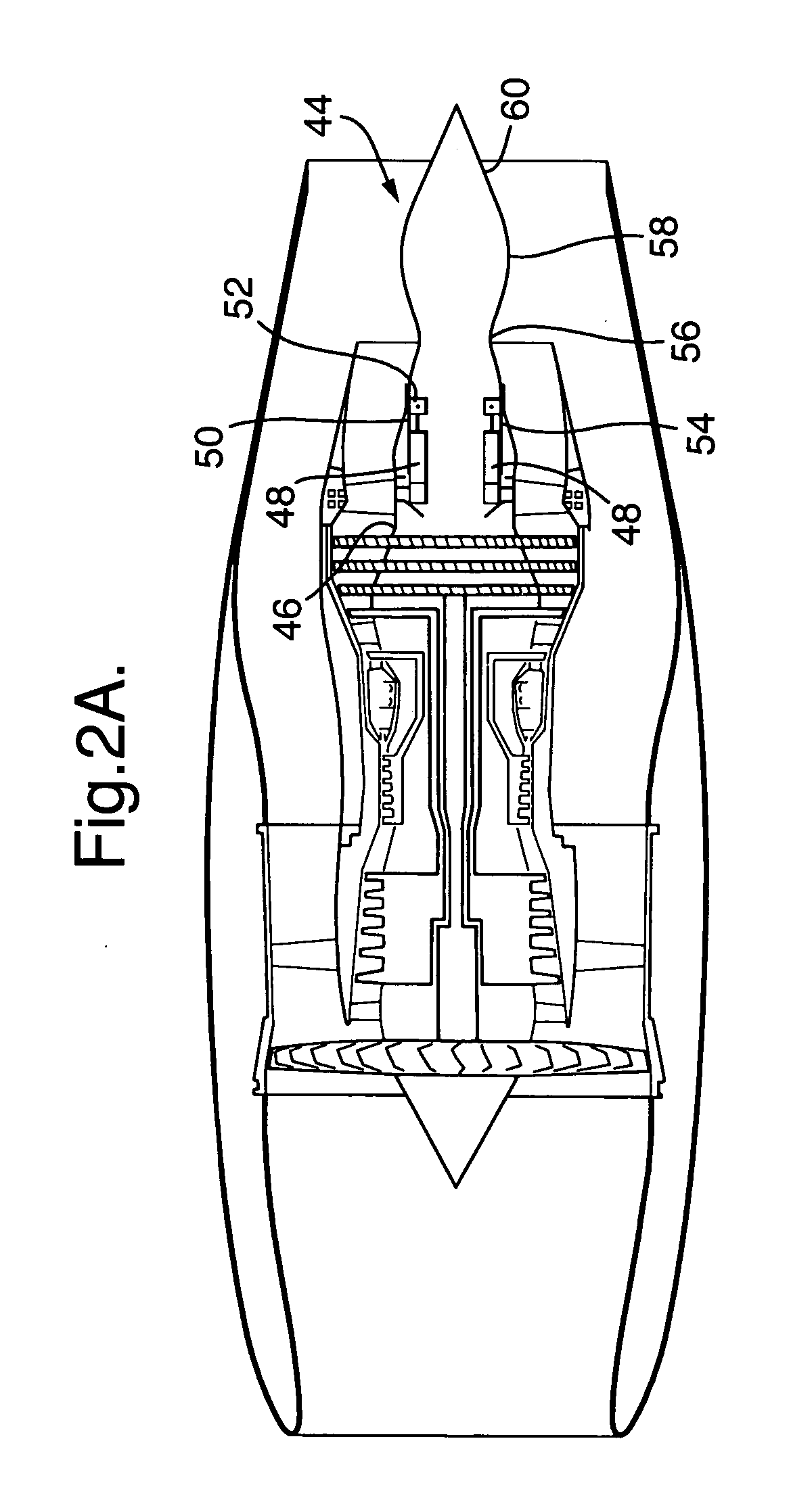 With reference to FIGS. 1A and 2A where reference numerals of one figure denote like elements of the other figure, a ducted fan gas turbine engine 10 comprises, in axial flow series an air intake 12, a propulsive fan 14, a core engine 16 and an exhaust nozzle assembly 18 all disposed about a main engine axis 20. The exhaust nozzle assembly 18 comprises an outer nozzle 17 and a radially inner nozzle 19. The core engine 16 comprises, in axial flow series, a series of compressors 22, a combustor 24, and a series of turbines 26. The direction of airflow through the engine 10, in operation, is shown by arrow A and the terms upstream and downstream used throughout this description are used with reference to this general flow direction. Air is drawn in through the air intake 12 and is compressed and accelerated by the fan 14. The air from the fan 14 is split between a core engine flow 28 and a bypass flow 30. The core engine flow 28 enters core engine 16, flows through the core engine compressors 22 where it is further compressed, and into the combustor 24 where it is mixed with fuel, which is supplied to, and burnt within the combustor 24. Combustion of the fuel with the compressed air from the compressors 22 generates a high energy and velocity gas stream, which exits the combustor 24 and flows downstream through the turbines 26. As the high energy gas stream flows through the turbines 26 it rotates turbine rotors extracting energy from the gas stream which is used to drive the fan 14 and compressors 22 via engine shafts 32 which drivingly connect the turbines rotors with the compressors 22 and fan 14. Having flowed through the turbines 26 the high energy gas stream from the combustor 24 still has a significant amount of energy and velocity and it is exhausted, as a core exhaust stream 28, through a core exhaust exit area 42 of the engine exhaust nozzle assembly 18 into a mixing area 36. The remainder of the air from, and accelerated by, the fan 14 flows within a bypass duct 34 around the core engine 16. This bypass airflow 30, which has been accelerated by the fan 14, flows through a bypass exit area 40 of the exhaust nozzle assembly 18 where it is mixed with the core engine flow 28 in the mixing area 36 and exhausted through a final exhaust area 38 to provide propulsive thrust. The bypass flow 30 provides the majority of the useful propulsive thrust of the engine 10.