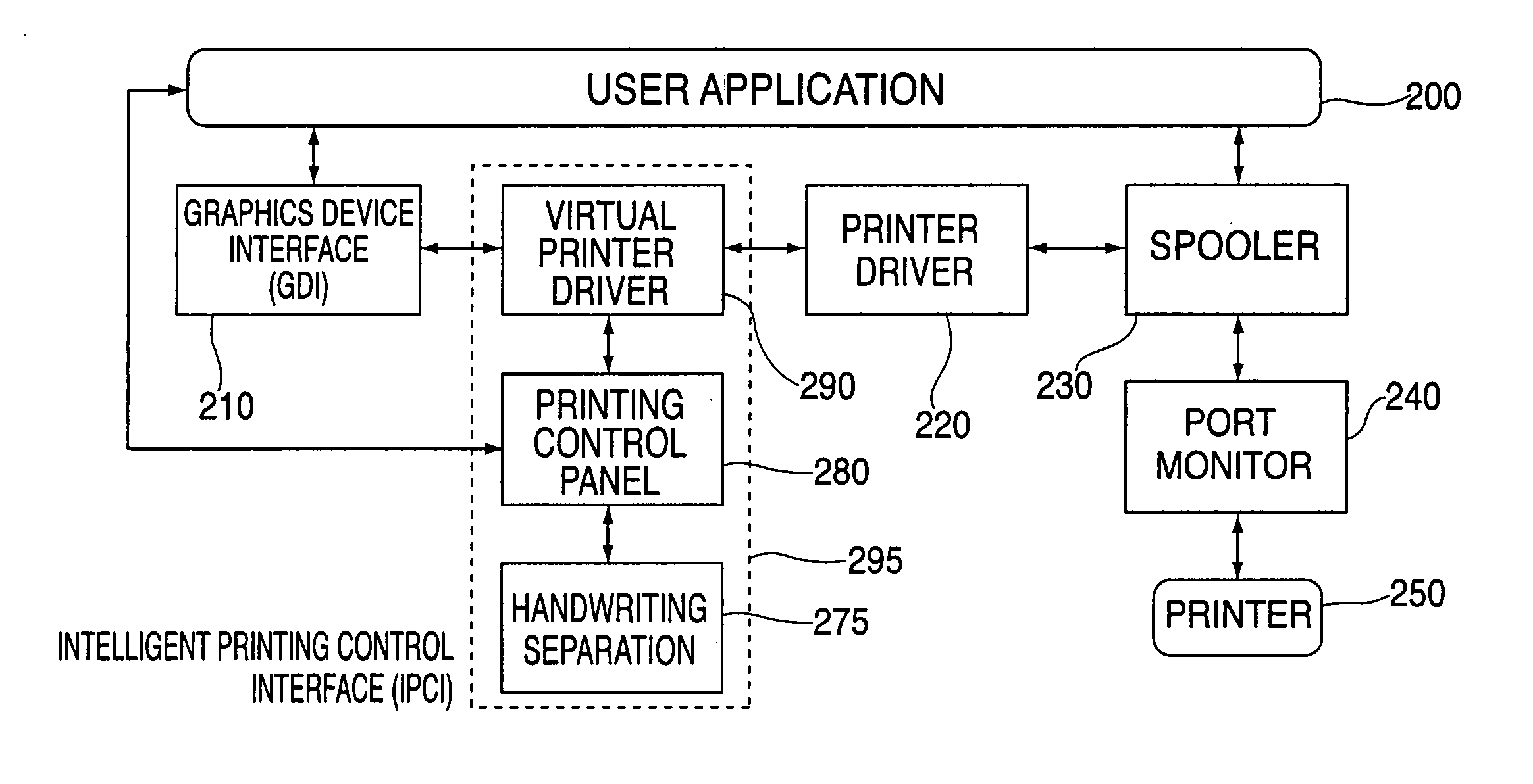 Referring now to the drawings and in particular FIG. 2, an intelligent printing control interface (IPCI) 295 is configured to create a printing/copying device having special image processing functions, i.e., the capability to separate handwritten annotations. This printing/copying device may be implemented within a general purpose computer system or within a dedicated printer/copier. IPCI 295 includes a virtual printer driver 290, a printing control panel 280 and a handwriting separation module 275. When a document generated by a user application 200 is to be printed, printing commands associated with that document are passed to graphics device interface (GDI) 210. GDI 210 conventionally processes those commands and passes them to IPCI 295 (instead of printer driver 220). IPCI 295, under the control of printing control panel 280, processes the printing commands to remove any handwritten annotations in the document, and passes the processed printing commands to printer driver 220 for printing in a conventional manner using spooler 230, port monitor 240 and printer 250, in the same manner as described above with respect to the first embodiment. Two types of documents are contemplated: (1) scanned documents having handwritten annotations added to an original document after being printed; and (2) a digital document having handwritten annotations generated using an on-line annotation tool.