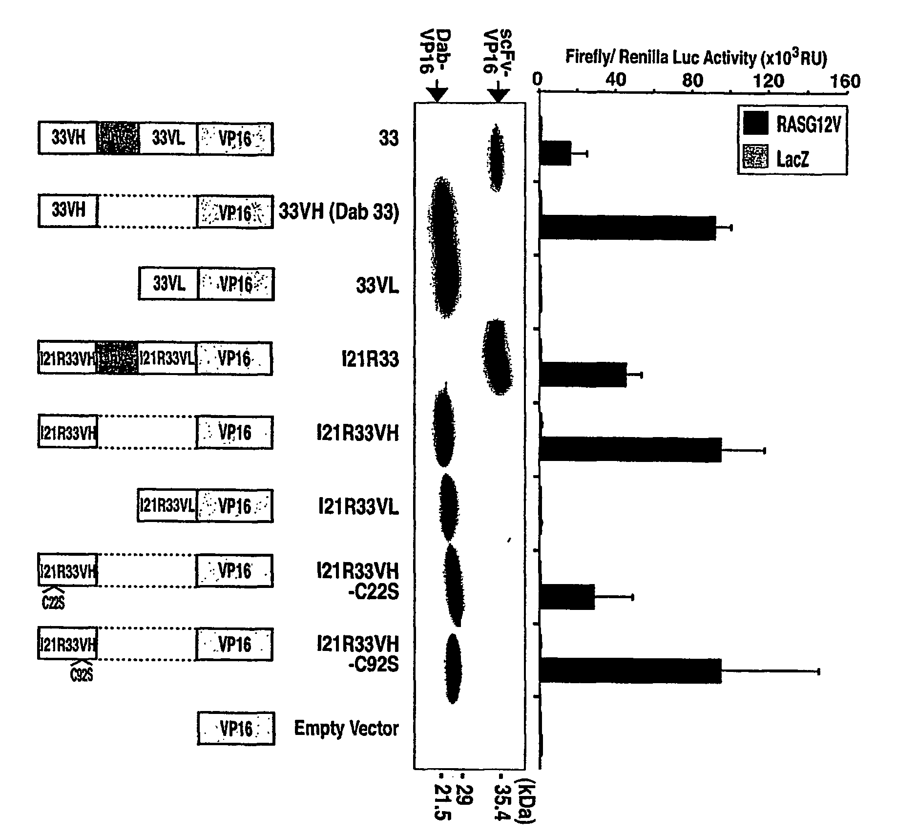 Affinity measurements of anti-RAS scFv and Dab using BIAcore. scFv/IDab Kon(M−1s−1) Koff (s−1) kd (nM) 33* 1.76 ± 1.41 × 105 1.13 ± 0.16 × 10−3 9.97 ± 8.82 I21R- 4.78 ± 0.95 × 104 8.65 ± 0.78 × 10−4 18.19 ± 1.85 33VHI21VL Dab 33 1.25 ± 0.12 × 104 1.44 ± 0.68 × 10−2 90.13 ± 9.70 IDab anti-RAS 5.66 ± 0.18 × 103 1.04 ± 0.01 × 10−3 182.98 ± 7.19 #3 IDab anti-RAS 2.32 ± 1.17 × 104 2.54 ± 0.34 × 10−3 121.45 ± 46.6 #10 IDab anti-RAS 2.73 ± 1.12 × 104 7.05 ± 2.28 × 10−4 26.65 ± 2.90 #12 REFERENCES