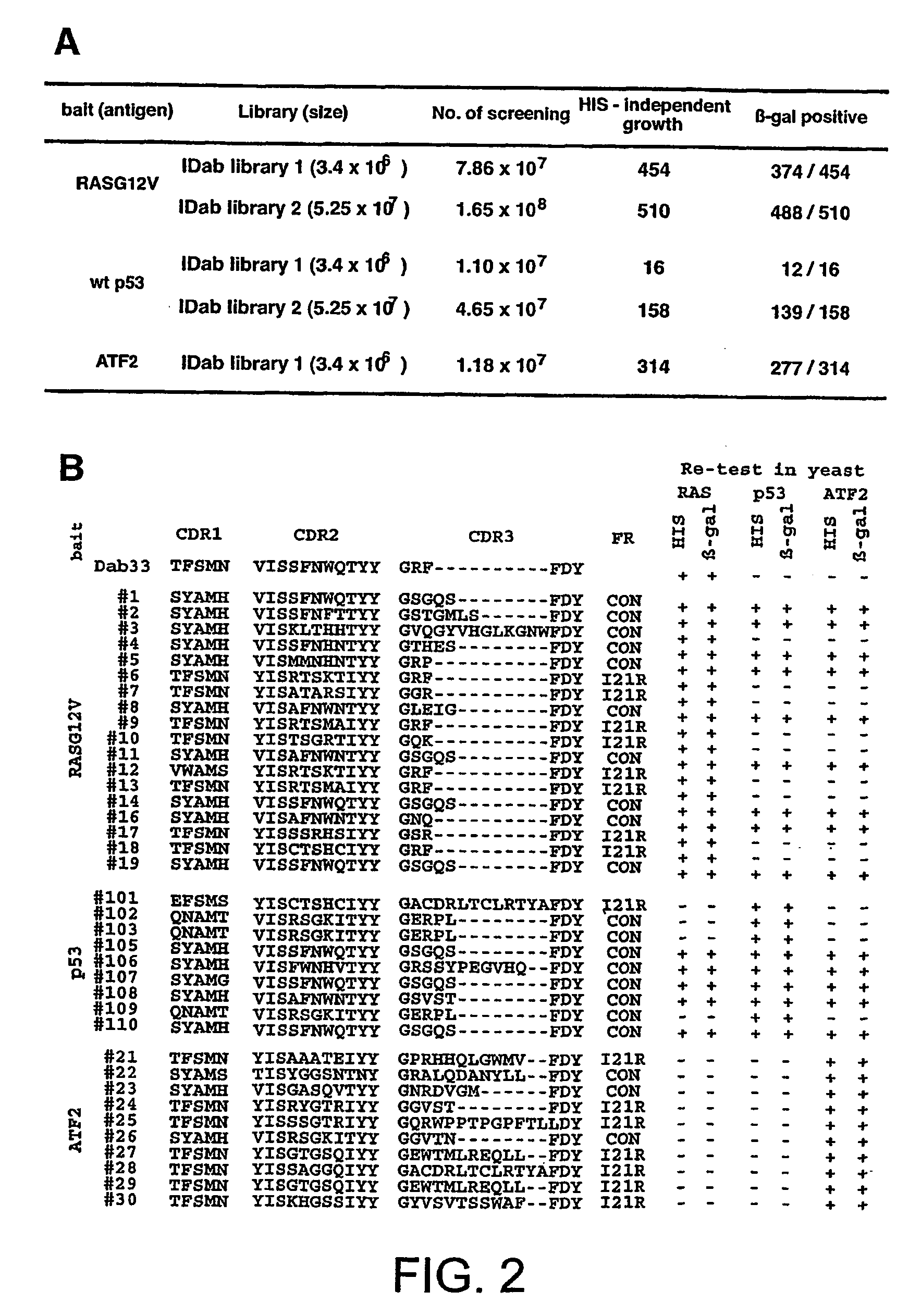 Definitions Single domain immunoglobulins, according to the present invention, refer to any single domain moieties which are capable of binding to a target. In particular, they include single domains derived from members of the immunoglobulin superfamily, a family of polypeptides which comprise the immunoglobulin fold characteristic of antibody molecules, which contains two β sheets and, usually, a conserved disulphide bond. Members of the immunoglobulin superfamily are involved in many aspects of cellular and non-cellular interactions in vivo, including widespread roles in the immune system (for example, antibodies, T-cell receptor molecules and the like), involvement in cell adhesion (for example the ICAM molecules) and intracellular signalling (for example, receptor molecules, such as the PDGF receptor). The present invention is applicable to single domain molecules derived from all immunoglobulin superfamily molecules which are capable of binding to target molecules. Preferably, the present invention relates to antibody single domains, in particular heavy chain variable (VH) domains. Single domain immunoglobulins are free of complementary domains, that is are not associated with other binding domains which, in nature or otherwise, may associate with the single domain to form a single composite binding site for a target. Specifically, VH domains are not in the presence of complementary VL domains in the single domains of the invention. However, further domains, such as antibody constant region domains, may be but need not be present. A domain is used in its ordinary meaning in the art; thus, a domain (typically of a polypeptide or protein) possesses an independent tertiary structure and an independent functional attribute. Domains may be assembled to form multi-domain proteins. Antibodies, as used herein, refers to complete antibodies or antibody fragments capable of binding to a selected target, and including Fv, ScFv, Fab′ and F(ab′)2, monoclonal and polyclonal antibodies, engineered antibodies including chimeric, CDR-grafted and humanised antibodies, and artificially selected antibodies produced using phage display or alternative techniques. Antibodies may be or be based on of any naturally-occurring antibody type, including IgG, IgE, IgA, IgD and IgM. Single domains, such as VH domains, may be derived from any such antibody. A molecule is any chemical structure, including an inorganic molecule, an organic molecule or a combination of the two. Typically, the molecule will be a polypeptide or a nucleic acid. Polypeptides are chains of amino acids joined through peptide bonds, and may comprise natural or synthetic amino acids, or combinations of the two. An active reporter molecule is a molecule which is capable of generating a signal, either directly or through a chemical or biological pathway. For example, an active reporter molecule may be a pair of fluorophores, which interact to generate a signal through FRET; or two domains of a transcription factor, which interact to form an active transcription factor; or domains of an enzyme, which interact to reconstitute a detectable enzyme activity. Heavy chain variable domain refers to that part of the heavy chain of an immunoglobulin molecule which forms part of the antigen binding site of that molecule. The abbreviation VH is used. Several subtypes, based on structural similarities, have been defined, for example as set forth in the Kabat database. Light-chain variable domain refers to that part of the light chain of an immunoglobulin molecule which forms part of the antigen binding site of that molecule. The abbreviation VL is used. Several subtypes, based on structural similarities, have been defined, for example as set forth in the Kabat database. The framework region of an immunoglobulin heavy and light chain variable domain has a particular 3 dimensional conformation characterised by the presence of an immunoglobulin fold. Certain amino acid residues present in the variable domain are responsible for maintaining this characteristic immunoglobulin domain core structure. These residues are known as framework residues and tend to be highly conserved. The framework supports the CDRs of an antibody. CDR (complementarity determining region) of an immunoglobulin molecule heavy and light chain variable domain describes those amino acid residues which are not framework region residues and which are contained within the hypervariable loops of the variable regions. These hypervariable loops are directly involved with the interaction of the immunoglobulin with the ligand. Residues within these loops tend to show less degree of conservation than those in the framework region. Intracellular means inside a cell, and the present invention is directed to those immunoglobulins which will bind to ligands/targets selectively within a cell. The cell may be any cell, prokaryotic or eukaryotic, and is preferably selected from the group consisting of a bacterial cell, a yeast cell and a higher eukaryote cell. Most preferred are yeast cells and mammalian cells. As used herein, therefore, “intracellular” immunoglobulins and targets or ligands are immunoglobulins and targets/ligands which are present within a cell. In addition the term ‘Intracellular’ refers to environments which resemble or mimic an intracellular environment. Thus, “intracellular” may refer to an environment which is not within the cell, but is in vitro. For example, the method of the invention may be performed in an in vitro transcription and/or translation system, which may be obtained commercially, or derived from natural systems. Consensus sequence of VH and VL chains in the context of the present invention refers to the consensus sequences of those VH and VL chains from immunoglobulin molecules which can bind selectively to a ligand in an intracellular environment. The residue which is most common in any one given position, when the sequences of those immunoglobulins 