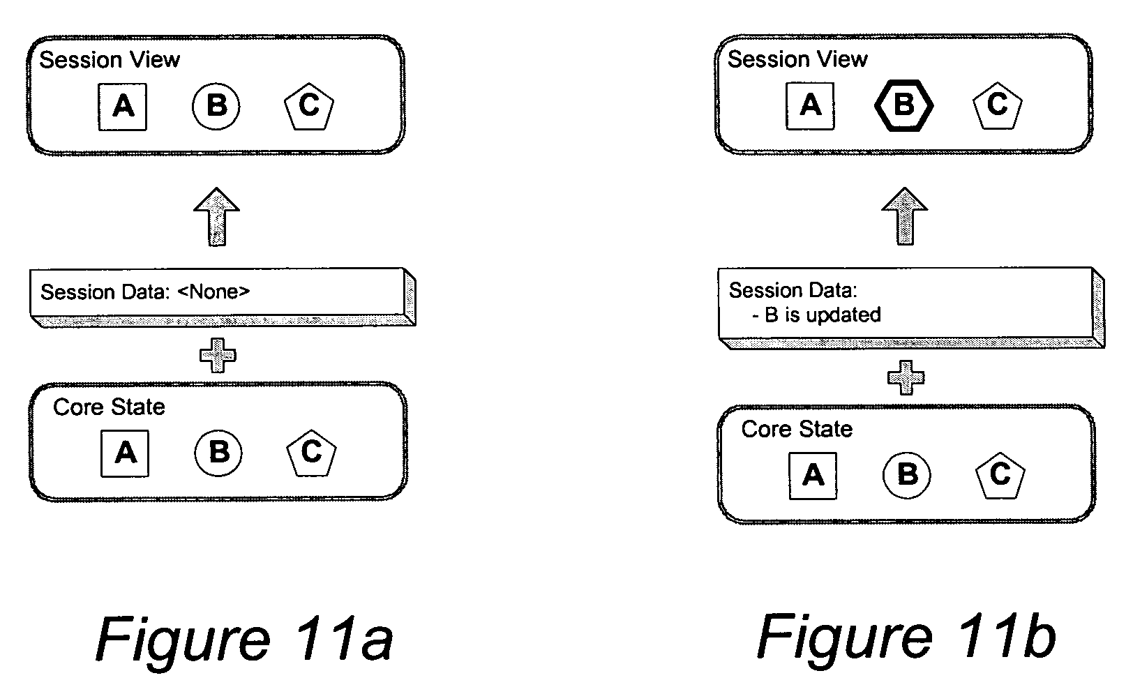 Runtime Rule Data in Accordance to an Embodiment FIELD NAME DESCRIPTION DATA TYPE Rule Name The name of the rule that is String currently executing. Binding Point Name The name of the binding String point that the rule is bound to. Entity Bound To The name of the entity with String which the binding point is associated. Entity Type The type of the “Entity Enum Bound To”. Entity URL The display URL of the URI entity. Data Elements A list of monitoring data List (e.g., elements and the runtime represented as an values for the elements at the XML document) associated binding point. where: data($message/order-amount) comparator value routes >= 100000 GoldService route >= 10000 SilverService route otherwise StandardService route Conflict Resolutions in Accordance to an Embodiment VALUE IN VALUE ORIGINAL CORE IN CONFLICT DESCRIPTION AND VALUE STATE SESSION RESOLVING OPTIONS Conflicting concurrent modification scenarios V Vc Vs Two conflicting updates: The user can resolve this conflict by doing one of the following: a) ACCEPT SESSION: Commit overwrites value in core with the value in session b) ACCEPT CORE: Commit preserves value in core state (effectively throwing away his changes) c) MERGE: merge the updates in both of them. This requires support from the console1. V NULL Vs Update in session, delete in core state: Ways of resolving: a) ACCEPT SESSION: Commit re-creates the component in the core state with the value in the session. b) ACCEPT CORE: Commit keeps the component deleted (unless doing so results in RI violation) V Vs NULL Delete in session, update in core state: Ways of resolving: a) ACCEPT SESSION: Commit deletes the component in the core state b) ACCEPT CORE: Commit leaves the component in core state intact. NULL Vc Vs Two conflicting creates: Ways of resolving: a) ACCEPT SESSION: Commit uses the value in session b) ACCEPT CORE: Commit uses the value in core NULL Vc NULL2 Conflicting create and create + delete: In this case the component is created in session and core state concurrently. However, the component is then deleted in session. Ways of resolving are: a) ACCEPT SESSION: Commit deletes the component in core b) ACCEPT CORE: Commit keeps the value in core state intact. Non-conflicting concurrent modification scenarios V Vx Vx Two updates with same value NULL Vx Vx Two creates with the same value V NULL NULL Two deletes never conflict