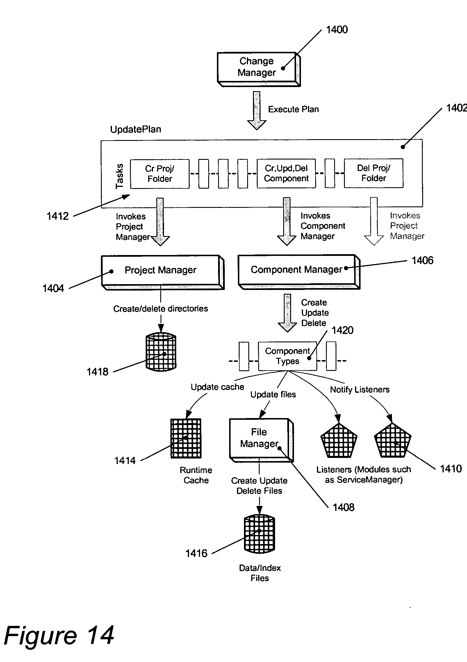 In one embodiment, an update plan is an object that describes what actions are to be performed by a server. A change manager that exists on each server is responsible for executing the actions described in the update plan. The Update Plan executed on an admin server may differ from that executed on a managed server. This section gives a very high-level overview of how updates are performed. It is not meant to be a complete picture of updates and recovery. In one embodiment, an update is initiated in the following cases: User updates: The user commits a batch update. An update plan is generated and executed on admin and managed servers. These updates typically occur on admin server and on managed servers. Managed server recovery: A managed server finds, after a prolonged disconnection from the admin server, that its configuration data is out of data. It thus requests an update plan from the admin server, that can be executed on the managed server and can bring the managed server configuration up-to-date. The updates are essentially the “deltas”. In the case of user updates, the update plan is first executed on admin server, and if it succeeds it is sent to managed servers simultaneously (and asynchronously) for execution there. In the case of managed server recovery, the managed server first sends a digest of all resources that it knows about and their version numbers. The admin server then compares this with is own data and if there are any discrepancies it prepares and update plan that can be executed on the managed server. In one embodiment, the update plan is sent to managed servers using a well-known JMS topic specifically configured for service bus. Each server (including admin) has a change manager component that is responsible for receiving the plan, executing it and, reporting the result back to the admin server. Each server is responsible for executing the update plan it receives. If the plan execution fails due to an application failure (e.g., an exception, not a server crash), the server is responsible for rolling it back all the changes that are performed by the update plan, to the state of the configuration that existed prior to executing the update plan. In other words the execution of a plan on a server is atomic. It either succeeds or fails. In either case the outcome is reported to the admin server. It is possible that the updates succeed on some servers, but fail on others. When this happens the updates on the successful servers can be rolled back, or undone. A server may crash during the execution of an update. When this happens it has to perform recovery during startup. In one embodiment and by way of illustration, recovery involves the following steps: 1) Rollback any local work that has been performed but not committed. Since there was a server crash, persisted data (files) need to be recovered, and rolled back to their before-image. 2) Furthermore, if on a managed server: a) Send a digest of the current contents of configuration to the admin server, and receive deltas. b) Apply these deltas locally to bring the managed server configuration up-to-date with the admin server. In one embodiment, an update plan describes changes that are needed to be applied to service bus configuration. An Update Plan is executed on admin server and managed servers, and it contains a list of “tasks” that describe individual changes. In one embodiment, there are five types of tasks: Create component task; Update component task; Delete component task; Create folder or project task; and Delete folder or project task. In general the update plan first executes tasks to create folders or projects, followed by any number of component tasks, and ends with tasks to delete folders and projects. In one embodiment, each task in the update plan provides the following functionality: Validate: validate the data that is affected without making any modifications in the system. Execute: once validated, execute simply performs the configuration change. Namely it creates, updates, and deletes stuff. In one embodiment, an update begins when the Change Manager 1400 gets an Update Plan 1402 and executes it. In aspects of this embodiment, an update plan is simply a list of tasks 1412, which can be executed in order. These tasks invoke methods of Project Manager 1404 or Component Manager 1406 in order to update/create/delete/rename components 1420, folders or projects 1418. Project Manager and Component Manager in turn update relevant stateful entities, such as runtime caches 1414, reference graphs, and files 1416. In a further embodiment, file updates are handled via the File Manager. In one embodiment, the various modules that listen to updates to component (for example Service Manager) 1410. These modules register for changes that occur on a particular component type, and are notified when an instance of that component type is created, delete, updated, or renamed. Listeners typically update their own internal state in response to these notifications. For example the transport manager deploys/un-deploys/suspends/resumes transport endpoints based on changes made to the definition of a service. These listeners hold state that can be rolled back when an error occurs. In one embodiment, in order to facilitate proper recovery the change manager can persistently record the following facts about the execution of a plan: 1) At the beginning of plan execution, write a record on the disk that indicates the execution has started. A simple string value such as “STARTED” is enough. 2) After successful execution, write a record on the disk that indicates the execution has successfully finished. A simple string value such as “SUCCESS” is enough. 3) After application failure, write a record on the disk that indicates the execution has failed and recovery is in flight. A simple string value such as “FAILED” is enough. In one embodiment, recovery is initiated after an application failure or a server crash.