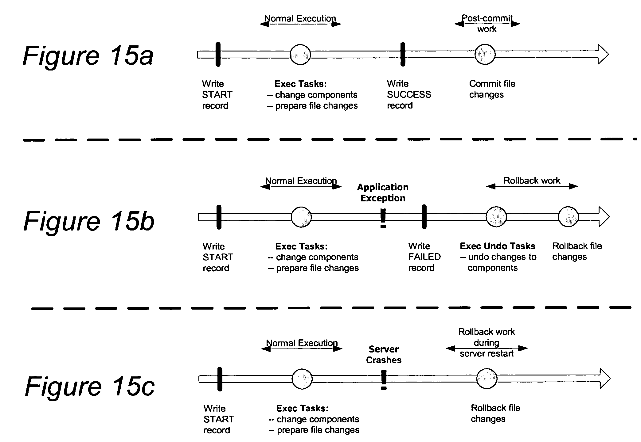 2In this case the component is created in session too, but then it is deleted. File Operations in Accordance to an Embodiment OP- ERATION PREPARE COMMIT ROLLBACK CreateFile Assert X does not Rename X.new Delete X.new (X) exist → X create file X.new UpdateFile rename X → Delete X.old Delete X.new (X) X.old Rename X.new Rename X.old → create file X.new → X X DeleteFile Rename X → Delete X.old Rename X.old → (X) X.old X RenameFile Prepare as if Y is Commit as if Y is Rollback as if Y is (X,Y) created and X is created and X is created and X is deleted deleted deleted
