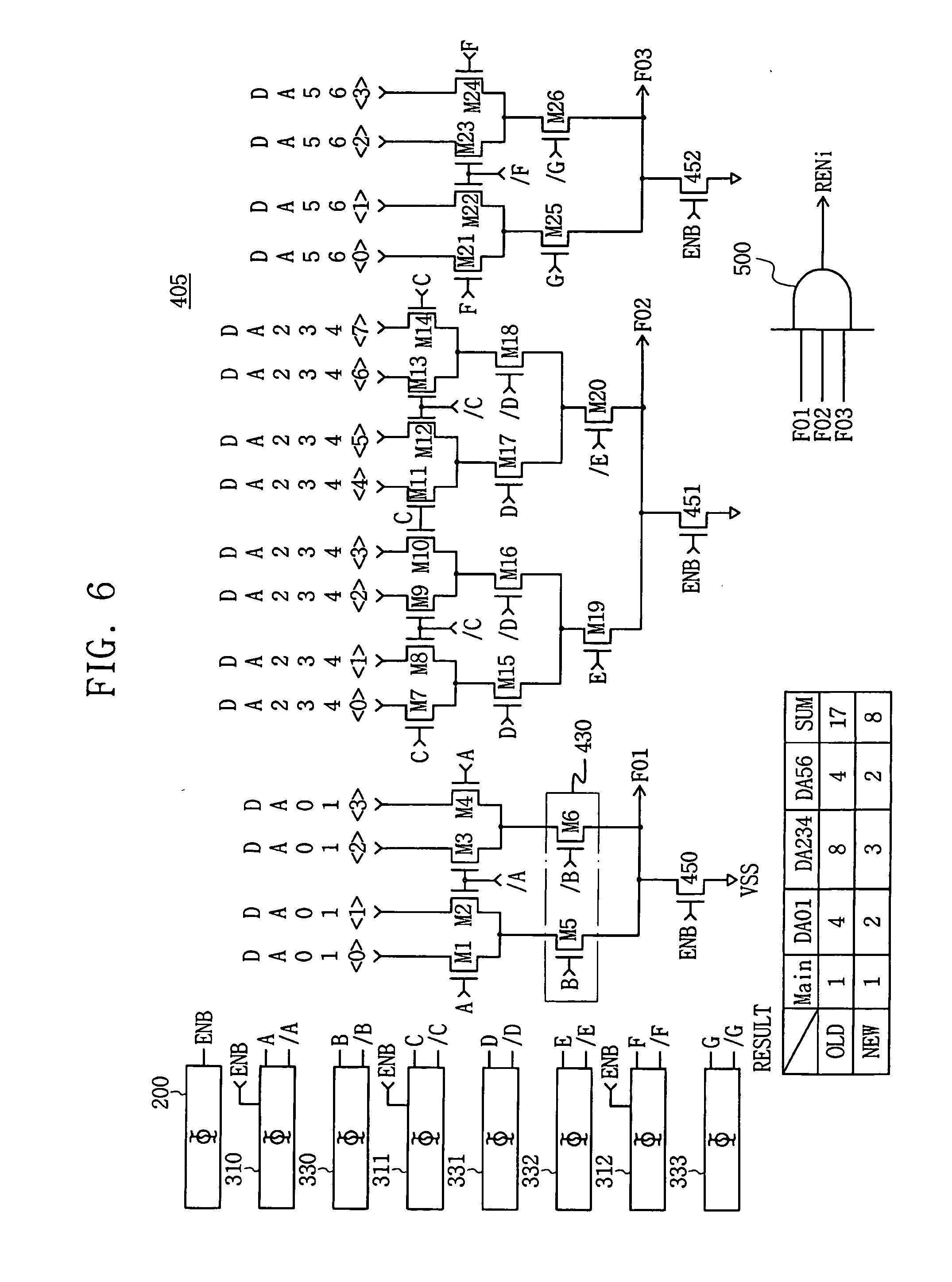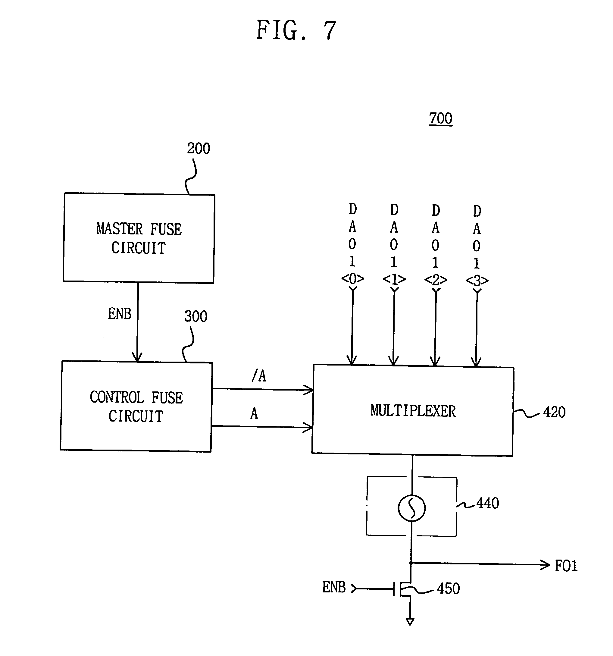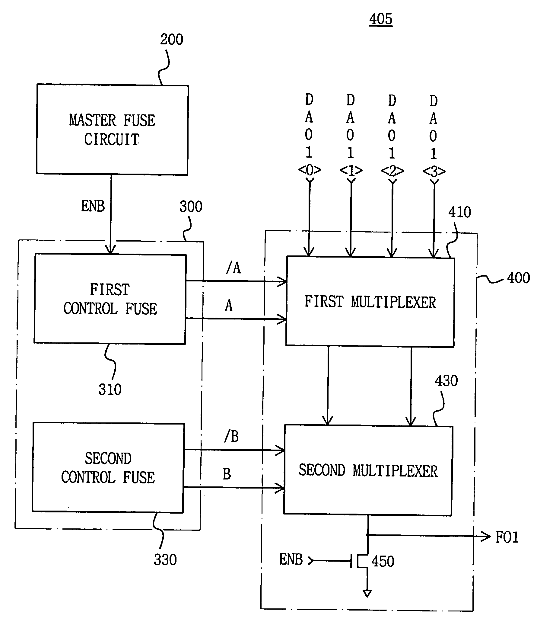 Alternatively, if the fuse F9 is cut, the input logic of signal bit IADD<2> may be cut off (e.g., the logic level may be the second logic level irrespective of the logic level of the signal bit IADD<2>). A signal path through transistor N11, transistor N13 and program output terminal FO2 may be activated and the signal bit IADD<2> of an internal address inverted by inverter IN1 may be applied as an input of the NAND gate NAN2.