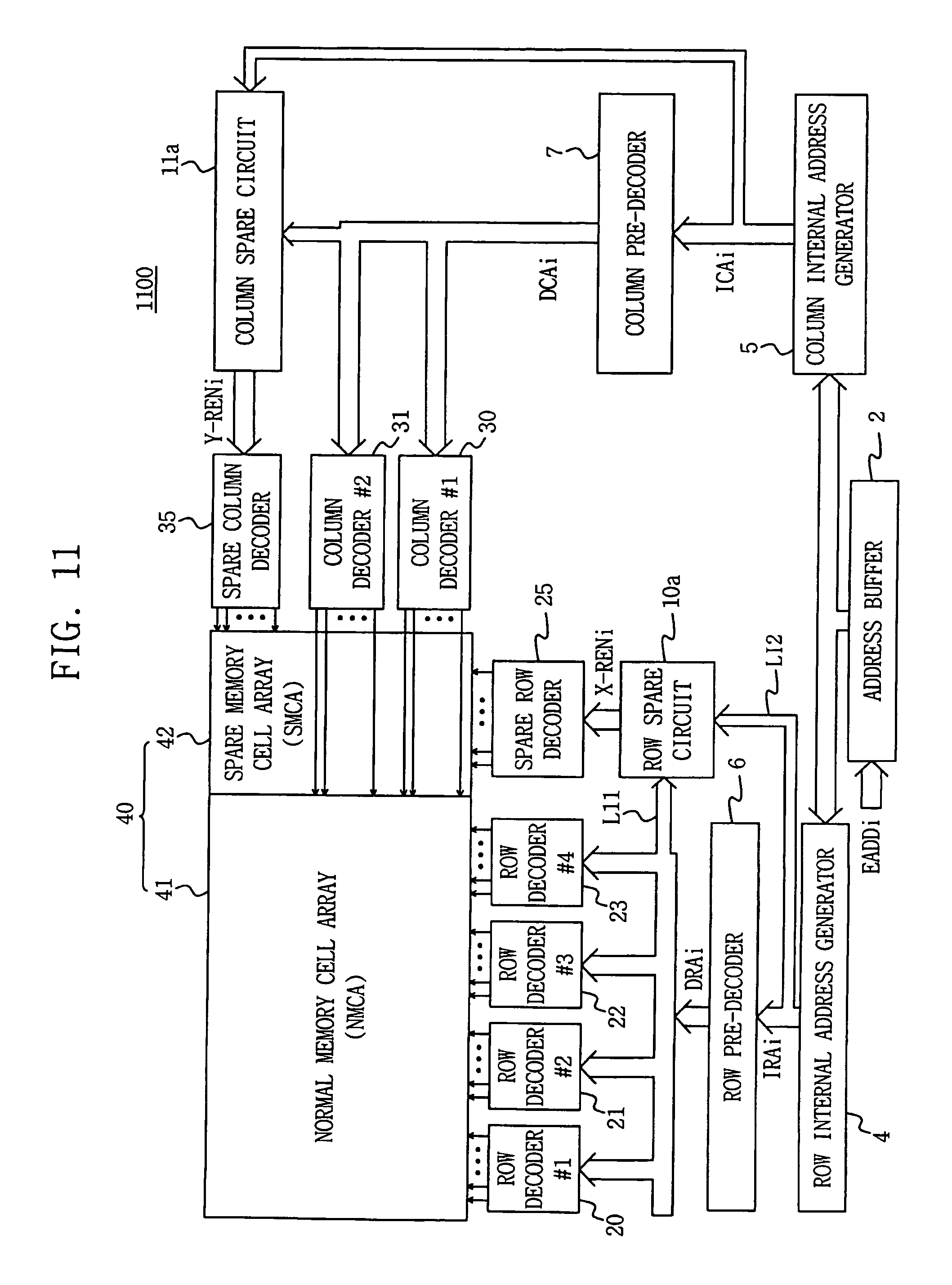 In the example embodiment of FIG. 11, a portion of signal bits of a decoded address of the row predecoder 6 (e.g., the output of row predecoder 6) may be transferred to an input line LI1 and thereby to the row spare circuit 10a. A portion of signal bits of an internal address outputted from the row internal address generator 4 (e.g., the input of row predecoder 6) may be transferred to an input line LI2 and thereby to the row spare circuit 10a.