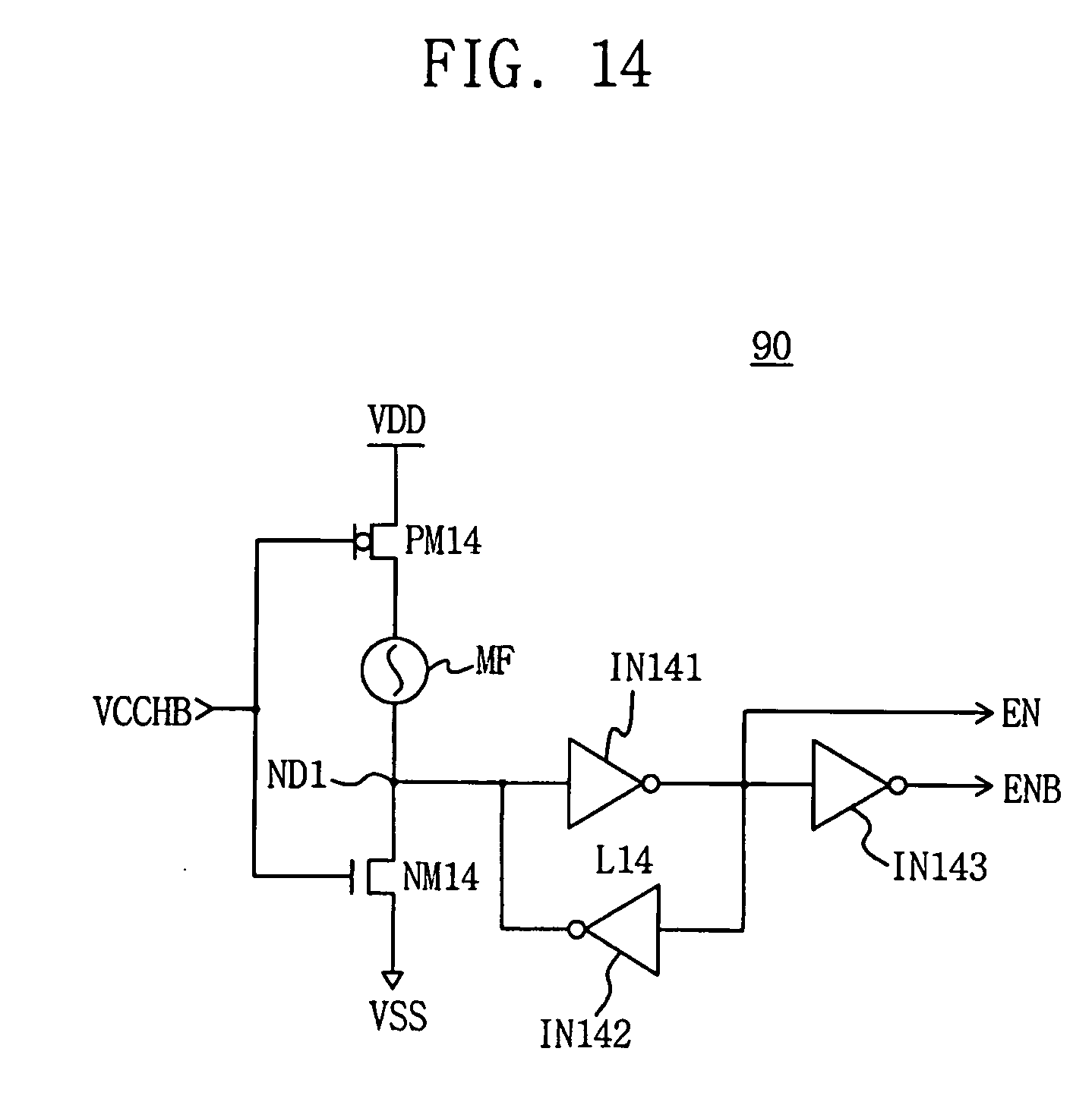 FIG. 14 is a circuit diagram illustrating the master fuse circuit 90 of FIG. 12 according to another example embodiment of the present invention. Master fuse circuit 90 may include PMOS transistor PM14 and NMOS transistor NM14 which may each be connected to the master fuse MF. The transistors PM14 and NM14 may receive the power-up bar signal VCCHB. Master fuse circuit 90 may further include an inverter latch L14 which may include inverters IN141 and IN142. The mater fuse circuit 90 may further include an output inverter IN143.