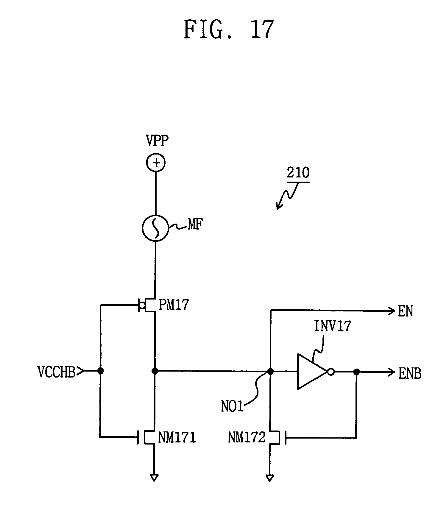 In the example embodiment of FIG. 17, the master fuse circuit 210 may include PMOS transistor PM17, NMOS transistors NM171/NM172 and inverter INV17. If the power-up bar signal VCCHB is applied at the first logic level and the master fuse MF is cut, the NMOS transistor NM171 may be turned on. An operation enable signal ENB of inverter INV17 may transition to the first logic level and an operation enable signal EN may transition to the second logic level. If the power-up bar signal VCCHB transitions to the second logic level, the NMOS transistor NM171 may be turned off and the output EN may be maintained at the second logic level (e.g., by a transition to the first logic level of the NMOS transistor NM172). Thus, the power-up bar signal VCCHB and the operation enable signal EN may be maintained at the second logic level.