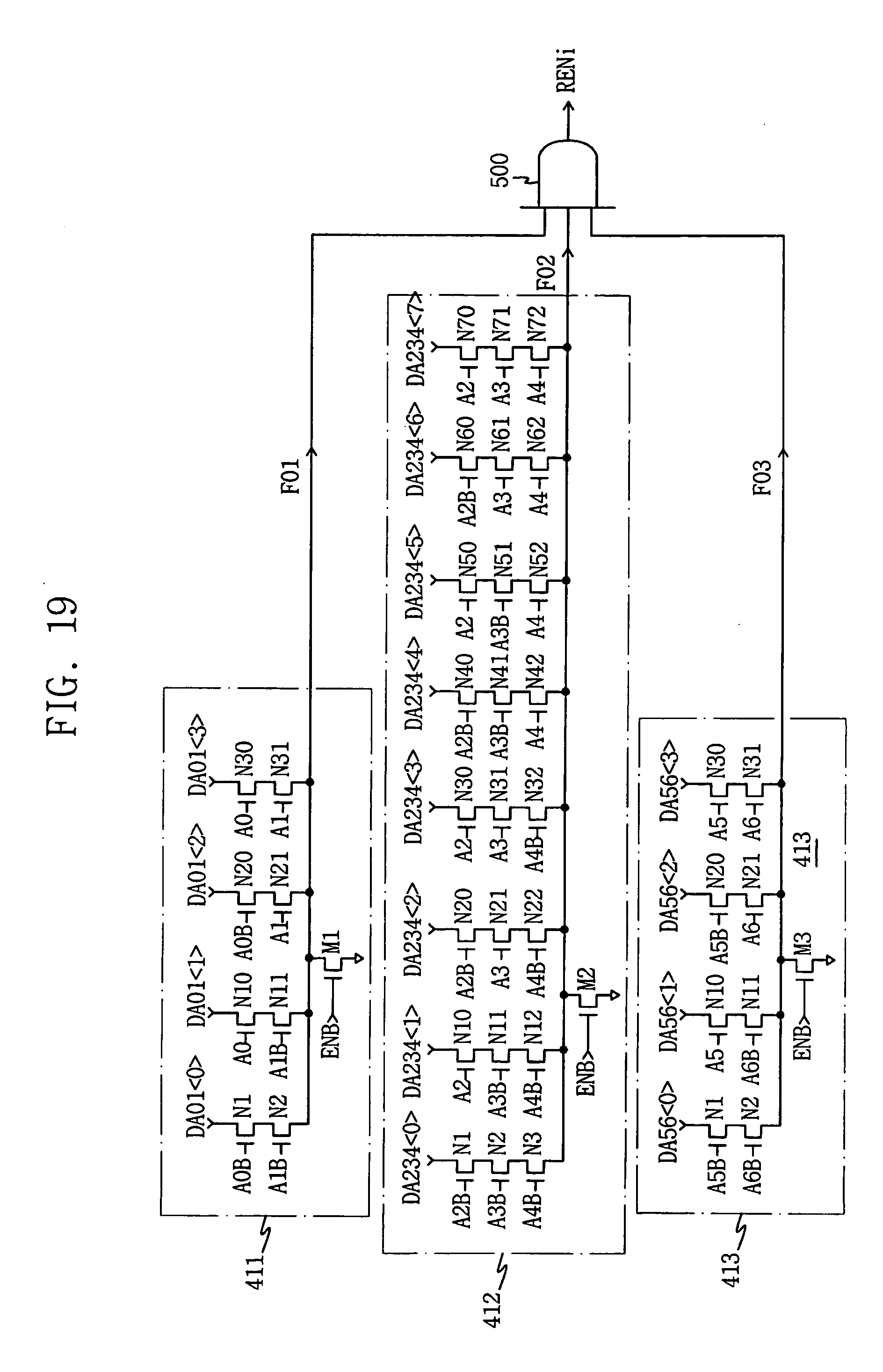 In the example embodiment of FIG. 19, the second decoder 412 may include unit decoders da234<0>-DA234<7> which may perform a redundancy decoding of an 8 bit decoding address. Each of the unit decoders may include NMOS transistors (e.g., NMOS transistors N1, N2 and N3 in DA234<0>), whose channels may be connected in series and may be controlled by a combinational logic input (e.g., a 3 bit combinational logic input).