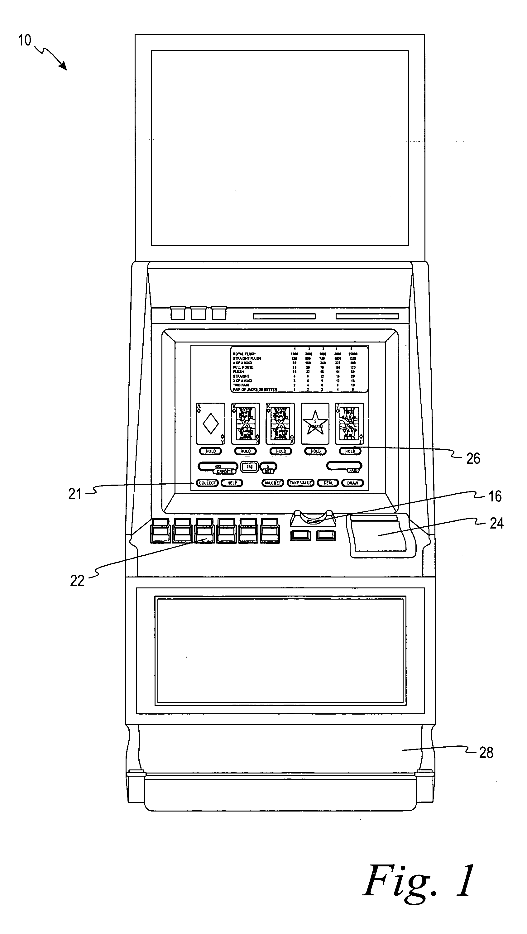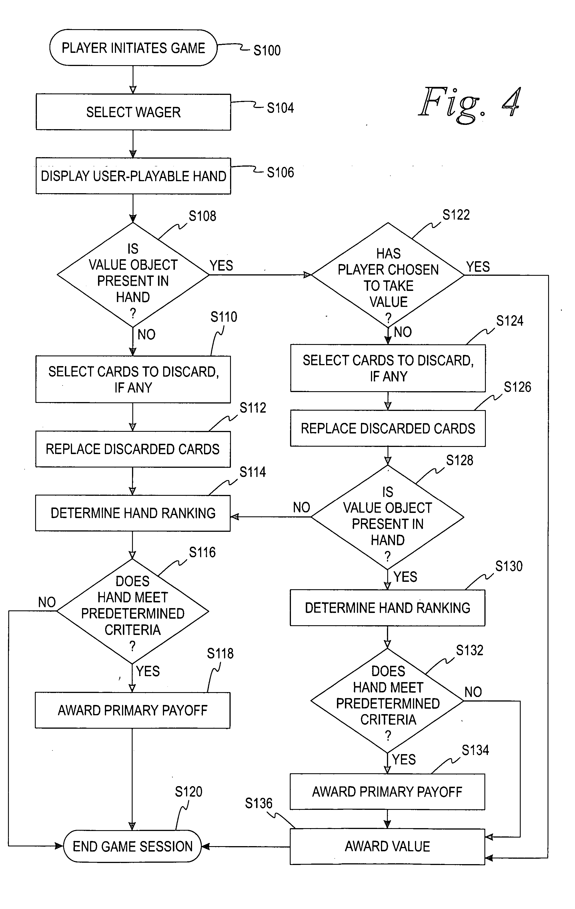 displaying a plurality of symbol-bearing objects to form a user-playable hand, wherein the plurality of symbol-bearing objects are selected from a standard set of objects and the standard set of objects contains at least one value symbol-bearing object; providing the ability to discard, via player selection, one or more of the displayed symbol-bearing objects from the user-playable hand; replacing each of the discarded symbol-bearing objects, if any, with a replacement symbol-bearing object from the standard set of objects and displaying the replacement symbol-bearing object to form a second user-playable hand; awarding the player a payoff based on a ranking of the second user-playable hand in response to the second user-playable hand meeting a predetermined criterion, wherein an additional payoff is awarded if at least one of the at least one value symbol-bearing object forms the second user-playable hand. 2. The method of 3. The method of 4. The method of 5. The method of 6. The method of 7. The method of 8. The method of 9. A computer readable storage medium encoded with instructions for directing a gaming device to perform the method of 10. A method of conducting a wagering game, comprising: