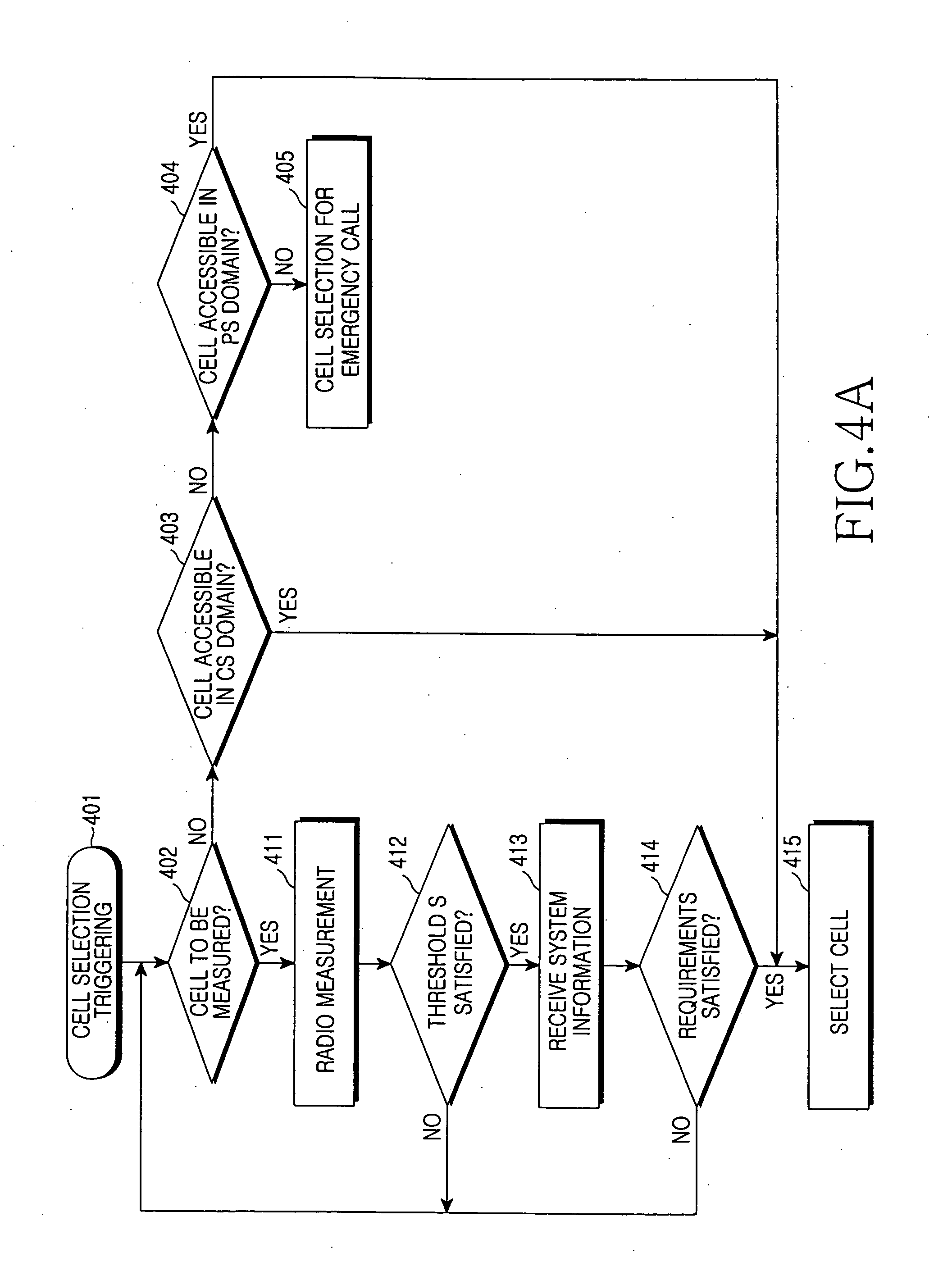 a user equipment (UE) for measuring radio strengths of cells being candidates for cell reselection, determining whether the radio strengths satisfy a predetermined threshold, prioritizing to rank cells that satisfy the threshold, receiving system information including access class barred lists for a plurality of service domains from a Node B managing a cell with a highest ranking among the prioritized cells, and selecting the cell if the access class barred lists indicate the cell as accessible in all of the service domains; and at least one Node B for managing at least one cell that the UE can access wirelessly and for transmitting the system information to the UE. 31. The mobile communication system of 32. The mobile communication system of 33. The mobile communication system of 34. The mobile communication system of