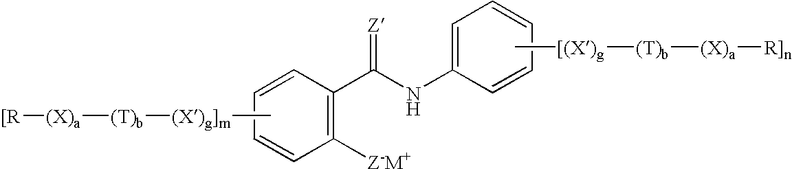 wherein m is an integer from 0 to 4; n is an integer from 0 to 5; the sum of m+n is greater than zero; a is 0 or 1; b is 0 or 1; g is 0 or 1; when b is 0, one of a and g must be 0; Z and Z′ are independently selected from O and S; X and X′, when present, are selected from O, S, and NR1, where R1 is independently selected from the group consisting of H, C1-C16 linear or branched, substituted or unsubstituted alkyl, alkenyl, alkynyl, cycloalkyl, cycloalkenyl, alkaryl, aralkyl, and aryl; T, when present, is selected from C═O, C═S, S═O, and SO2; when T is S═O or S2, X and X′ may not be S; when either a, b or g is 1 for a radical R-(X)a-(T)b-(X′)g-, R for that radical is independently selected from the group consisting of H, C1-C16 linear or branched, substituted or unsubstituted alkyl, alkenyl, alkynyl, cycloalkyl, cycloalkenyl, alkaryl, aralkyl, and aryl; when a, b and g are all 0 for a radical, R for that radical may be further selected from the group consisting of F, Cl, Br, I, CN, R2N→O, NO2; when all a, b and g are 0, at least one R must be non-H; further provided that the total number of halogen atoms in the molecule excluding any present in R does not exceed two; R2 is independently selected from the group consisting of C1-C16 linear or branched, substituted or unsubstituted alkyl, alkenyl, alkynyl, cycloalkyl, cycloalkenyl, alkaryl, aralkyl, and aryl, and mixtures thereof; derivatized substituted salicylanilide anions, wherein one or both aromatic rings comprise additional substituents, are also suitable for use herein; substituted salicylanilide and derivatives thereof are disclosed in US 2002/0068014A1 and WO 04/026821; M+ is a cation selected from the cations of the ionic liquids as disclosed herein;