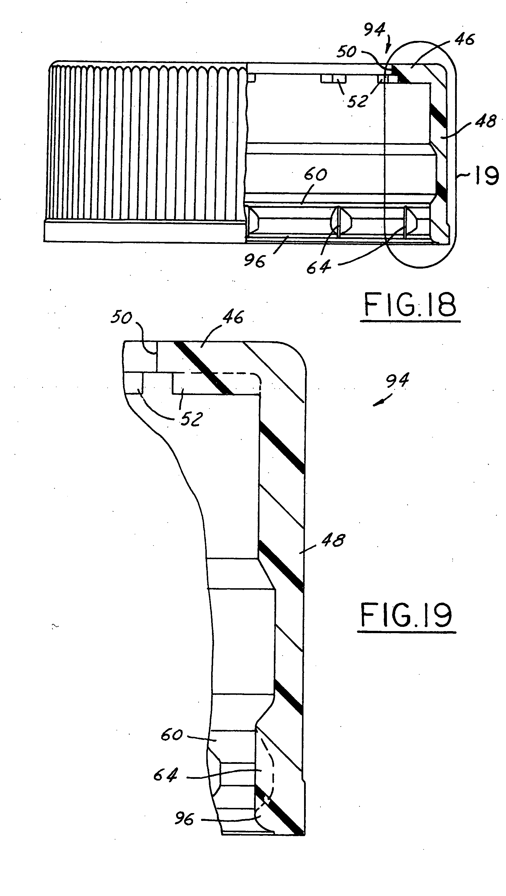 [0040]FIGS. 18 and 19 illustrate an outer shell 94 in which circumferential spacing between ribs 64 is as in the embodiment of FIGS. 16-17, and in which skirt 48 has a lower internal bead 96 with the same inner diameter as upper internal bead 60. Provision of a lower internal bead having a lesser diameter than upper internal bead 60 is preferred to help retain the inner closure shell within the outer closure shell, as previously described.