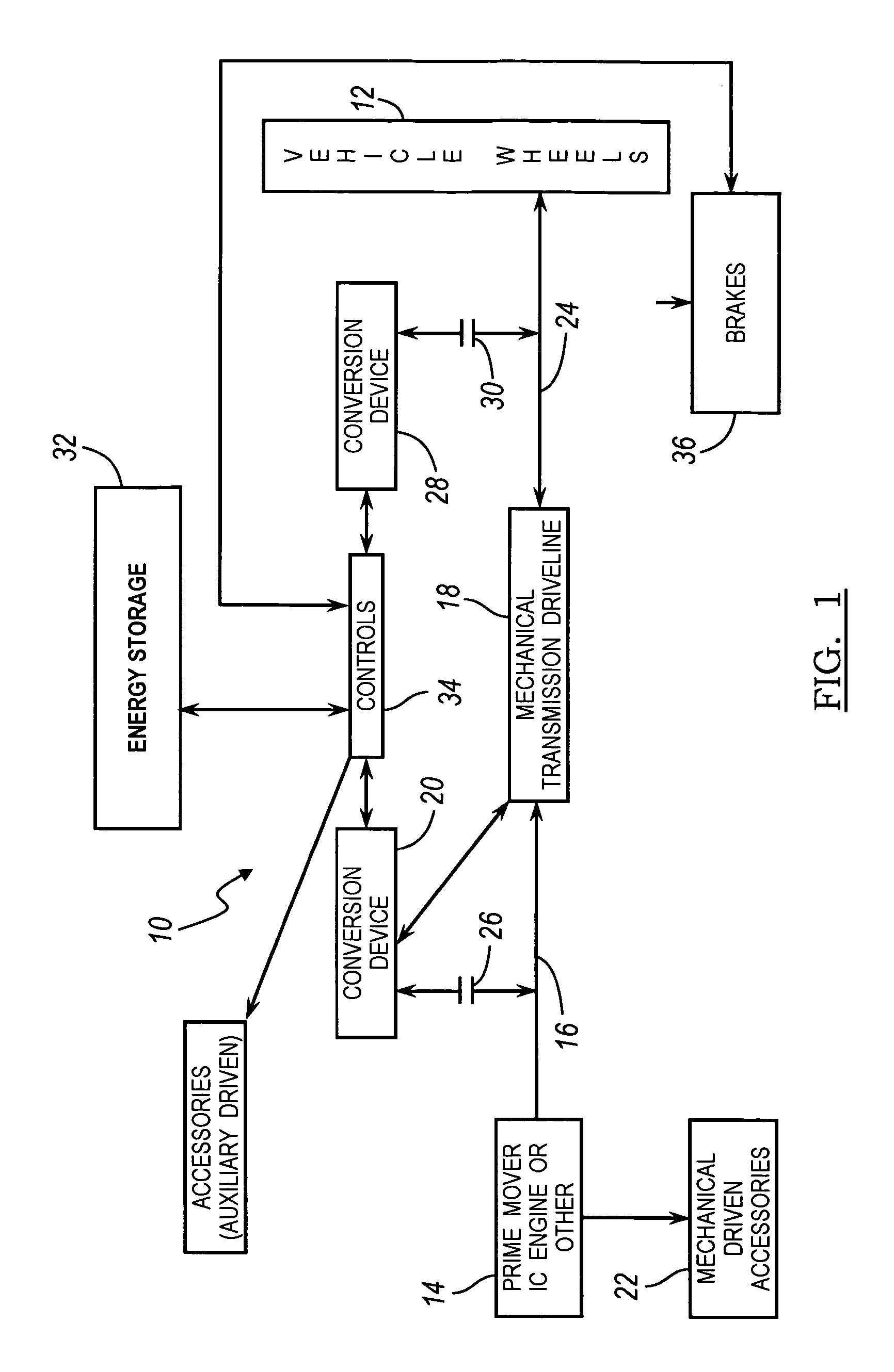 A powertrain for transmitting power in a vehicle includes a prime mover having a relatively slow transient response, and a storage device for storing energy in a predetermined form. A transmission includes an input driveably connected to the prime mover and an output driveably connected to vehicle drive wheels, producing a range of ratios of a speed of the output to a speed of the input that varies from negative to positive and includes zero. An energy conversion device, driveably connected to the prime mover and drive wheels, converts rotational power transmitted to the energy conversion device from the wheels and the prime mover to a form of energy that can be stored in the storage device, and drives the wheels using energy supplied to the energy conversion device from the storage device. A control device alternately transmits energy from the storage device to the energy conversion device, and transmits energy from the energy conversion device to the storage device.