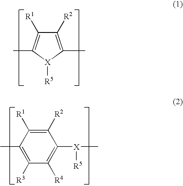 Examples of the polymer containing a repeating unit represented by formula (1), (2) or (3) include polyaniline, polyoxyphenylene, polyphenylene sulfide, polythiophene, polyfuran, polypyrrole, polymethylpyrrole, and substitution derivatives and copolymers thereof. Among these, preferred are polypyrrole, polythiophene and substitution derivatives thereof (e.g., poly(3,4-ethylenedioxythiophene)).
