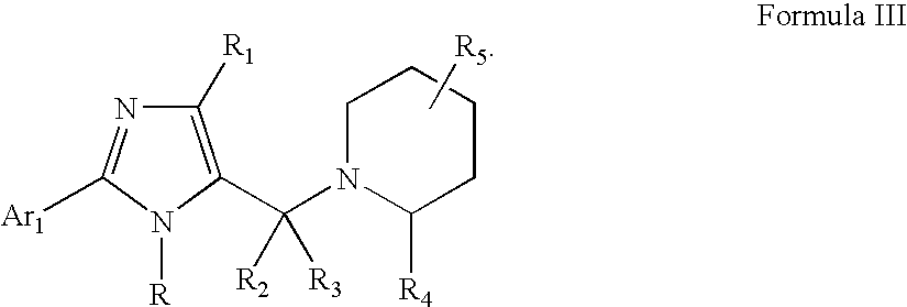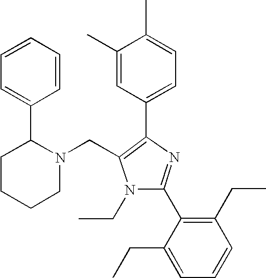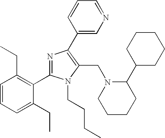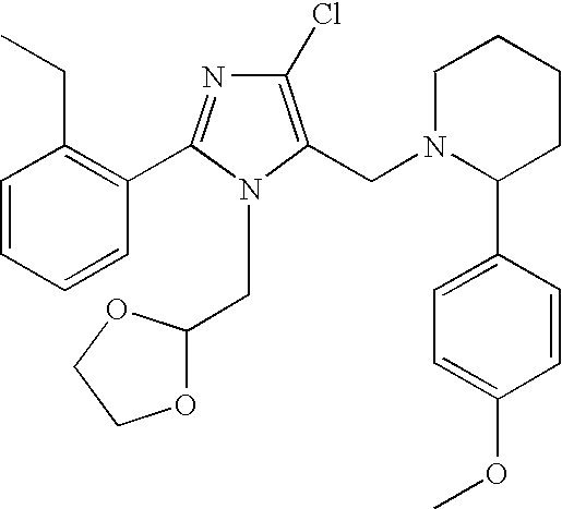 Gradient- time(min) % B 0 10 0.01 10 2.0 100 3.5 100 3.51 10 3.52 57 1-{[1-butyl-4-chloro-2- (2,6-diethylphenyl)-1H- imidazol-5-yl]methyl}-2- (3,4-dimethoxyphenyl) piperidine 1.15 523.3 524.3 58 1-{[1-butyl-4-chloro-2-(2,6-diethylphenyl)-1H- imidazol-5-yl]methyl}-2- (3,4-dimethoxyphenyl)- 6-methylpiperidine 1.16 537.3 538.4 59 3-(1 -{[1-butyl-4-chloro- 2-(2,6-diethylphenyl)- 1H-imidazol-5- yl]methyl}piperidin-2- yl)pyridine 1.18 464.3 465.3 60 1-{[1 -butyl-4-chloro-2- (2-methylphenyl)-1H- imidazol-5-yl]methyl}-2- (3,4-dimethoxyphenyl) piperidine 1.1 481.2 482.3 61 1-{[1-butyl-4-chloro-2- (2-methylphenyl)-1H- imidazol-5-yl]methyl}-2- (3,4-dimethoxyphenyl)- 6-methylpiperidine 1.1 495.3 496.3 62 2-(1,3-benzodioxol-5-yl)- 1-{[1-butyl-4-chloro-2- (2-methylphenyl)-1H- imidazol-5- yl]methyl}piperidine 1.12 465.2 466.2 63 1-{[1-butyl-4-chloro-2- (2-methylphenyl)-1H- imidazol-5-yl]methyl}-2- (2,3-dimethoxyphenyl) piperidine 1.13 481.2 482.3 64 1-{[1-butyl-4-chloro-2- (2-methylphenyl)-1H- imidazol-5-yl]methyl}-2- (4-methoxy-2,3- dimethylphenyl) piperidine 1.17 479.3 480.3 65 1-{[4-bromo-2-(2,6- diethylphenyl)-1-(1,3- dioxolan-2-yl]methyl)- 1H-imidazol-5- 1]methyl}-2-(3,4- dimethoxyphenyl) piperidine 1.09 597.2 598.5 66 2-(1,3-benzodioxol-5-yl)- 1-{[4-bromo-2-(2,6- diethylphenyl)-1-{1,3- dioxolan-2-ylmethyl)- 1H-imidazol-5- yl]methyl}piperidine 1.15 581.2 582.1 67 1-{[1-butyl-4-chloro-2- (2,6-dimethylphenyl)- 1H-imidazol-5- yl]methyl}-2-(3,4- dimethoxyphenyl) piperidine 1.15 495.3 496.3 68 2-(1,3-benzodioxol-5-yl)- 1-{[1-butyl-4-chloro-2- (2,6-dimethylphenyl)- 1H-imidazol-5- yl]methyl}piperidine 1.17 479.2 480.2 69 1-{[1-butyl-4-chloro-2- (2,6-dimethylphenyl)- 1H-imidazol-5- yl]methyl}-2-(4- methoxy-2,3- dimethylphenyl) piperidine 1.22 493.3 494.3 70 2-(1,3-benzodioxol-5-yl)- 1-{[4-chloro-2-(2,6- dimethylphenyl)-1- methyl-1H-imidazol-5- yl]methyl}piperidine 1.11 437.2 438.2 71 1-[(1-butyl-2,4-diphenyl- 1H-imidazol-5- yl)methyl]-2-(3,4- dimethoxyphenyl)piperidine 1.13 509.3 510.3 72 1-[(1-butyl-2,4-diphenyl- 1H-imidazol-5- yl)methyl]-2-(4- methoxy-2,3- dimethylphenyl) piperidine 1.19 507.3 508.3 73 2-(1,3-benzodioxol-5-yl)- 1-[(1-butyl-2,4-diphenyl- 1H-imidazol-5- yl)methyl]piperidine 1.17 493.3 494.3 74 1-{[4-chloro-1-(1,3- dioxolan-2-ylmethyl)-2- (2-ethylphenyl)-1H- imidazol-5-yl]methyl}-2- (3- methoxyphenyl)piperidine 1.08 495.2 496.4 75 1-{[4-chloro-1-(1,3- dioxolan-2-ylmethyl)-2- (2-ethylphenyl)-1H- imidazol-5-yl]methyl}-2- (2-methoxyphenyl) piperidine 1.07 495.2 496.4 76 1-{[1-butyl-4-chloro-2- (2-methylphenyl-1H- imidazol-5-yl]methyl)-2- (4-methoxyphenyl) piperidine 1.12 451.2 452.4 77 1-{[1-butyl-4-chloro-2- (2-methylphenyl)-1H- imidazol-5-yl]methyl}-2- (3-methoxyphenyl) piperidine 1.13 451.2 452.4 78 1-{[1-butyl-4-chloro-2- (2-methylphenyl)-1H- imidazol-5-yl]methyl}-2- (2-methoxyphenyl) piperidine 1.11 451.2 452.4 79 1-{[4-chloro-1-(1,3- dioxolan-2-ylmethyl)-2- (2-ethylphenyl)-1H- imidazol-5-yl]methyl}-2- cyclohexylpiperidine 1.09 471.3 472.4 80 1-{[1-butyl-4-chloro-2- (2-methylphenyl)-1H- imidazol-5-yl]methyl}-2- cyclohexylpiperidine 1.14 427.3 428.4 81 1-{[4-chloro-1-(1,3- dioxolan-2-ylmethyl)-2- (2-ethylphenyl)-1H- imidazol-5-yl]methyl}-2- (4-methoxyphenyl) piperidine 1.08 495.2 496.4 82 1-{[4-chloro-1-(1,3- dioxolan-2-ylmethyl)-2- (2-ethylphenyl)-1H- imidazol-5-yl]methyl}-2- (3,4-dimethoxyphenyl) piperidine 1.06 525.2 526.5 83 1-{[4-chloro-1-(1,3- dioxolan-2-ylmethyl)-2- (2-ethylphenyl)-1H- imidazol-5-yl]methyl}-2- (4-methoxy-2,3- dimethylphenyl) piperidine 1.11 523.3 524.5 84 2-(1,3-benzodioxol-5-yl)- 1-{[4-chloro-1-(1,3- dioxolan-2-ylmethyl)-2- (2-ethylphenyl)-1H- imidazol-5-yl]methyl}piperidine 1.12 509.2 510.2 85 1-{[4-chloro-1-(1,3- dioxolan-2-ylmethyl)-2- (2-ethylphenyl)-1H- imidazol-5-yl]methyl}-2- (2,3-dimethoxyphenyl) piperidine 1.12 525.2 526.2 86 1-{[4-chloro-1-(1,3- dioxolan-2-ylmethyl)-2- (2-ethylphenyl)-1H- imidazol-5-yl]methyl}-2- (3,4-dimethoxyphenyl)- 6-methylpiperidine 1.11 539.3 540.3 87 1-{[4-bromo-2-(2,6- diethylphenyl)-1-(1,3- dioxolan-2-ylmethyl)- 1H-imidazol-5- yl]methyl}-2-(3,4- dimethoxyphenyl) piperidin-4-one 88 ethyl 1-{[1-butyl-4- chloro-2-(2- methylphenyl)-1H- imidazol-5- yl]methyl}piperidine-2- carboxylate 1.21 417.2 418.2 89 ethyl 1-{[4-chloro-1- (1,3-dioxolan-2- ylmethyl)-2-(2- ethylphenyl)-1H- imidazol-5- yl]methyl}piperidine-2- carboxylate 1.13 461.2 462.2 90 1-{[4-bromo-2-(2,6- diethylphenyl)-1-(1,3- dioxolan-2-ylmethyl)- 1H-imidazol-5- yl]methyl}-2-(2,3- dihydro-1,4-benzodioxin- 6-yl)piperidine 1.15 595.2 596.2 91 1-{[4-chloro-1-(1,3- dioxolan-2-ylmethyl)-2- (2-ethylphenyl)-1H- imidazol-5-yl]methyl}-2- (2,3-dihydro-1,4- benzodioxin-6- yl)piperidine 1.11 523.2 524.2 92 1-{[1-butyl-4-chloro-2- (2-methylphenyl)-1H- imidazol-5-yl]methyl}-2- (2,3-dihydro-1,4- benzodioxin-6- yl)piperidine 1.16 479.2 480.2 93 methyl 4-(1-{[1-butyl-4- chloro-2-(2,6- dimethylphenyl)-1H- imidazol-5- yl]methyl}piperidin-2- yl)-2-methoxybenzoate 1.18 523.3 524.3 94 1-{[1-butyl-2-(2,6- diethylphenyl)-4-phenyl- 1H-imidazol-5- dihydro-1,4-benzodioxin- 6-yl)piperidine 1.18 563.4 565.6 95 1-{[1-butyl-2-(2,6- diethylphenyl)4-phenyl- 1H-imidazol-5- yl]methyl}-2-(3,4- dimethoxyphenyl) piperidine 1.15 565.4 566.6 96 1-{[1-butyl-2-(2,6- diethylphenyl)-4-phenyl- 1H-iniidazol-5- yl]methyl}-2- cyclohexylpiperidine 1.21 511.4 512.6 97 1-{[1-butyl-2-(2,6- diethylphenyl)-4-phenyl- 1H-imidazol-5- yl]methyl}-2-(4- ethoxyphenyl) piperidine 1.18 535.4 536.6 98 2-(1,3-benzodioxol-5-yl)- 1-{[1-butyl-2-(2,6- diethylphenyl)-4-phenyl- 1H-imidazol-5- yl]methyl}piperidine 1.19 549.3 551.6 99 1-{[1-butyl-4-chloro-2- (2,6-diethylphenyl)-1H- imidazol-5-yl]methyl}-2- (2,3-dihydro-1,4- benzodioxin-6- yl)piperidine 1.15 521.3 522.5 100 1-{[1-butyl-4-chloro-2- (2,6-diethylphenyl)-1H- imidazol-5-yl]methyl}-2- cyclohexylpiperidine 1.19 469.3 470.5 101 1-{[-butyl-4-chloro-2- (2,6-diethylphenyl)-1H- imidazol-5-yl]methyl)-2- (4-methoxyphenyl) piperidine 1.16 493.3 494.5 102 4-(1-{[1-butyl-4-chloro- 2-(2,6-dimethylphe