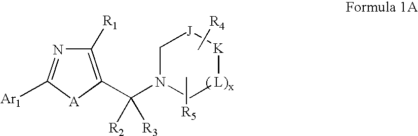 Scheme 2 illustrates a method for preparing compounds of Formula I wherein A is O or S and Ar1, R1, R2, R4, R5 and x are as defined in Formula 1. In step 1,4-substituted oxazole or thiazole J is lithitated with a suitable base such as n-BuLi and reacted with a brominating agent such as NBS to obtain 2-bromo oxazole or thiazole K. Step 2 involves coupling of 2-bromo oxazole or thiazole K with a suitable metaloaryl derivative using transition metal catalysis (e.g., Suzuki reaction) to obtain 2-aryl oxazole or thiazole L. Those skilled in the art will recognize that a broad array of metaloaryl derivatives (e.g., aryltin and arylzinc derivatives) and transition metal catalysts may be used in step 2, depending on the aryl group to be introduced. In step 3, electrophilic bromination of 2-aryl oxazole or thiazole L with a suitable brominating agent such as NBS yields 5-bromo derivative M. Step 4 involves transmetallation of halogen at the 5-position in M followed by reaction with DMF or a similar reagent to obtain aldehyde N. Aldehyde N may be reduced in step 5 to obtain alcohol O or reacted with a suitable organometallic reagent (e.g., R2MgX, where X is Cl, Br or I) in step 5′ to obtain alcohol O′. In step 6 and step 6′, alcohols O and O′ are converted to the corresponding chlorides P and P′. In step 7 and step 7′, chlorides P and P′ are reacted with suitable amines to obtain compounds of Formula I (Q). Those skilled in the art will recognize that alternative leaving groups can be introduced in steps 6 and 6′ and subsequently employed in steps 7 and 7′. Further, alternative reaction conditions may be employed to convert aldehyde N to amino adduct Q. For example, aldehyde N often may be converted to amino adduct Q by reaction with appropriate amines under reductive amination conditions. Specific examples for the preparation of compounds of Formula I (and the other Formulas provided herein) by the methods illustrated in the above Schemes are provided in the following Examples. Unless otherwise specified all starting materials and reagents are of standard commercial grade, and are used without further purification, or are readily prepared from such materials by routine methods. Those skilled in the art of organic synthesis will recognize that starting materials and reaction conditions may be varied to achieve the desired end product. Sodium hydride (1.05 mmol) is added to a solution of 3,4-dichloroimidazole (1, 1 mmol) in anhydrous DMF (5 mL) at 0° C. under nitrogen. After stirring at room temperature for 30 minutes, 1-iodobutane (1 mmol) is added and the reaction mixture is heated at 60° C. for 2 hours. The reaction mixture is cooled to room temperature, water is added, and the product is extracted with ethyl acetate. The organic layer is washed with water and brine and then dried over sodium sulfate. Evaporation and purification by chromatography on silica provides compound 2. LC-MS (M+1): 194. NBS (1.86 g, 1.05 mmol) is added to a solution of 1-butyl-4,5-dichloro-1H-imidazole (2, 1.95 g, 10 mmol) in acetonitrile (50 mL) at room temperature in portions. The reaction mixture is stirred at room temperature for 30 minutes. Ethyl acetate (100 mL) is added and the reaction mixture is washed with water, then brine, and dried over MgSO4. The product is filtered and evaporated in vacuo to dryness. The crude product is purified by flash chromatography (hexane/ethyl acetate 100/5) to give compound 3. LC-MS (M+1): 271. A solution containing 2-bromo-1-butyl-4,5-dichloro-1H-imidazole (3, 2.74 g, 10 mmol), 2,6-dimethylphenylboronic acid (4, 2.0 g, 12 mmol.) and Pd(PPh3)4 (0.23 mg, 0.2 mmol) in toluene/2M Na2CO3 (30 mL/15 mL) in a sealed tube is degassed, and then allowed to heat to 110° C. overnight. The organic layer is separated and concentrated in vacuo to dryness. The residue is purified by column chromatography on silica gel (hexane/ethyl acetate 100/5) to yield compound 5. LC-MS (M+1): 297. N-BuLi (1.6M in hexane, 9.4 mL, 15 mmol) is added dropwise at −78° C. to a solution of N-butyl-4,5-dichloro-2-(2,6-dimethyl-phenyl)-1H-imidazole (5, 3.27 g, 10 mmol.) in anhydrous THF. After addition, the reaction mixture is stirred at −78° C. for 2 hours. Anhydrous DMF (3 eq.) is then added in one portion. The mixture is stirred at −78° C. for 30 minutes, and then allowed to warm to room temperature slowly. The reaction mixture is stirred continuously overnight. The reaction is quenched with water and extracted with ethyl acetate, dried over MgSO4, filtered, concentrated in vacuo, and purified via chromatography on silica gel to give compound 6. LC-MS (M+1): 291. Sodium borohydride (2 eq.) is added at room temperature to a solution of 3-butyl-5-chloro-2-(2,6-dimethyl-phenyl)-3H-imidazole-4-carbaldehyde (6, 291 mg, 1 mmol) in anhydrous methanol. The mixture was stirred for 2 hours. After removing the methanol, water is added and the product extracted with ethyl acetate. The organic phase is washed with brine, dried over anhydrous sodium sulfate, and concentrated. The residue is purified by column chromatography to yield compound 7. LC-MS (M+1): 293. Thionyl chloride (0.2 mL) is added to a solution of [3-butyl-5-chloro-2-(2,6-dimethyl)-3H-imidazol-4-yl]-methanol (7, 30 mg, 0.1 mmol) in anhydrous chloroform (2 mL). The mixture is heated at 60° C. for 2 hours. The solvent and excess thionyl chloride are then removed under reduced pressure. The residue 8 is dried in vacuo and use for use in the next step without further purification. 2-Benzo[1,3]dioxol-5-yl-piperidine (9, 21 mg, 0.1 mmol), potassium carbonate (28 mg, 0.2 mmol) and potassium iodide (10 mg) are added to a solution of 1-butyl-4-chloro-5-chloromethyl-2-(2,6-dimethyl-phenyl)-1H-imidazole (8, 0.1 mmol) in anhydrous acetonitrile (2 mL). The mixture is heated at 100° C. for 16 hours. After cooling to room temperature, the mixture is filtered though a short silica gel pad and the solids are washed with ethyl acetate. The filtrate 