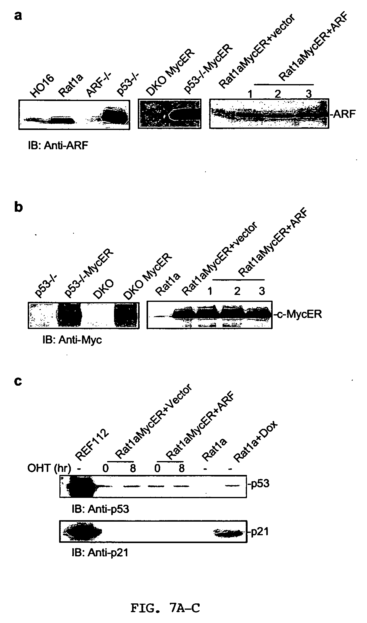 Northern Blot Analysis. Total RNA was prepared from cells with TRIzol reagent (Invitrogen). Ten μg of total RNA was separated on 1% agarose, 5.4% formaldehyde denaturing gels and transferred to Hybond-N+ membranes (Amersham). Blots were then UV crosslinked, prehybridized, hybridized, and washed according to the manufacturer's instructions (ULTRAhyb; Ambion). cDNA probes were labeled with [32P]-dCTP (ICN) using the Primelt II random labeling kit (Stratagene). Cell Proliferation and Apoptosis Assays. One day after seeding at 5×104/35 mm dish in media containing 10% FCS, p53−/− MycER and DKO MycER MEFs were treated with 1 mM OHT as indicated and refed with media containing 1 mM OHT daily. The number of attached cells (living cells) and floating cells (apoptotic cells) was determined in triplicate at the indicated times. Apoptosis was confirmed by detection of caspase-3 activation using a specific antibody (Pab CM1; BD PharMingen). Each time course was representative of at least two different monoclonal cell lines. For growth rate analysis of Rat1a MycER or Rat1a MycER+ARF monoclonal cell lines, cells were seeded and treated as described above except cells were shifted into media containing 20% FCS and 0.25 mM OHT. For the apoptosis assay, Rat1a MycER cell or Rat1a MycER+ARF cell lines were plated at 2.5×105/35 mm dish and shifted 48 hr later into media containing 0.5% serum without or with 1 mM OHT for 4 days. The number of floating (apoptotic) and attached (living) cells was determined in triplicate at the indicated times. Apoptosis was confirmed using DNA fragmentation analysis as described previously (Xiao et al., 1998. The data was converted to ratio of apoptotic cells to living cells and plotted over time. Representative data is shown from experiments using four different monoclonal cell lines. When ARF was examined as a nucleolar marker during studies examining c-Myc localization in immortalized mouse embryo fibroblasts (MEF) lacking p53, the inventors observed that ARF shifted localization in response to increased c-Myc. In untransfected cells, endogenous ARF protein was found in nucleoli and colocalized with nucleolin (FIGS. 1A-C), as has previously been shown (Weber et al., 1999). In contrast, in cells expressing increased levels of c-Myc-YFP (yellow fluorescent protein), ARF colocalized with c-Myc-YFP in a diffuse nucleoplasmic staining pattern (FIGS. 1D-F). Higher expression of c-Myc resulted in a more complete exclusion of ARF from nucleoli ( To determine whether the two proteins interact, the inventors expressed c-Myc and ARF individually or together and immunoprecipitation was performed using c-Myc antibody under stringent detergent conditions. Immunoblot analysis was then performed using ARF antibody. When coexpressed, ARF coimmunoprecipitated with c-Myc ( To identify the domains of c-Myc that interact with ARF, coimmunoprecipitation assays were carried out with a panel of c-Myc proteins having deletions, including deletions of the C-terminal helix-loop-helix/leucine zipper (HLH/LZ) domain, which is necessary for heterodimerization with c-Myc's partner Max, and the amino-terminal transcriptional regulatory domain (TRD), which is critical for transcriptional activation and repression (Grandori and Eisenman, 1997). The c-Myc proteins with deletions of the TRD (DN) or the HLH/LZ (DC) domains were still able to bind ARF, albeit less efficiently ( ARF binds to regions of c-Myc that are critical for its transcriptional activity, so the inventors next examined the effect of ARF on the activity of c-Myc responsive promoters. In MEF cells lacking ARF (ARF−/−), c-Myc alone increased the activation of the telomerase reverse transcriptase (htert) promoter by approximately three-fold ( The inventors next wanted to determine the effect of ARF on the regulation of endogenous c-Myc target genes in a defined p53 null background. Thus, they compared p53/ARF double-knockout (DKO) and p53−/− MEFs that express the chimaeric c-MycER protein (ER, oestrogen receptor), whose activity is inducible upon hydroxytamoxifen (OHT) treatment. Immunofluorescence analysis demonstrated that ARF relocalizes to the nucleoplasm upon activation of c-MycER (data not shown), as shown for transiently expressed c-Myc (FIGS. 1A-L). Real-time polymerase chain reaction (PCR) analyses revealed that activated c-MycER induced the expression of nucleolin, eIF4E, tert, cdk4 and cul1 ( ARF effectively blocked the induction of c-Myc target genes and colocalizes with c-Myc in the nucleoplasm, so the inventors wanted to determine whether ARF protein associates with c-Myc protein at the promoters of c-Myc target genes. Chromatin immunoprecipitation (ChIP) analysis revealed that ARF protein specifically associates with the promoters of eIF4E and nucleolin upon activation of c-MycER in p53−/− MEFs ( The inventors next wanted to determine whether ARF influences c-Myc biological functions, independently of p53. The inventors examined the proliferation rate of the DKO and p53−/− MEFs expressing c-MycER. Without activation of c-MycER, the p53−/− and DKO MEFs proliferate at similar rates ( The effects of ARF on c-Myc functions were also examined in Rat1a cells that have been used by the inventors (Xiao et al., 1998) and others (Evan et al., 1992) to demonstrate that c-Myc causes hyperproliferation, transformation and apoptosis in low serum. These cells express low levels of endogenous ARF ( Although p53 has been proposed to mediate c-Myc-induced apoptosis and ARF-induced apoptosis and growth arrest (Zindy et al., 1998), there are numerous reports demonstrating p53-independent apoptosis in vivo and in vitro caused by c-Myc or ARF (Harrington et al., 1994; Lenahan and Ozer, 1996; Amanullah et al., 2000; Fukasawa et al., 1997; Korgaonkar et al., 2002; Sakamuro et al., 1995; Trudel et al., 1997; Tsuji et al., 2002; Weber et al., 2000). The results suggest that when ARF is induced by elevated c-Myc, it prevents hyper