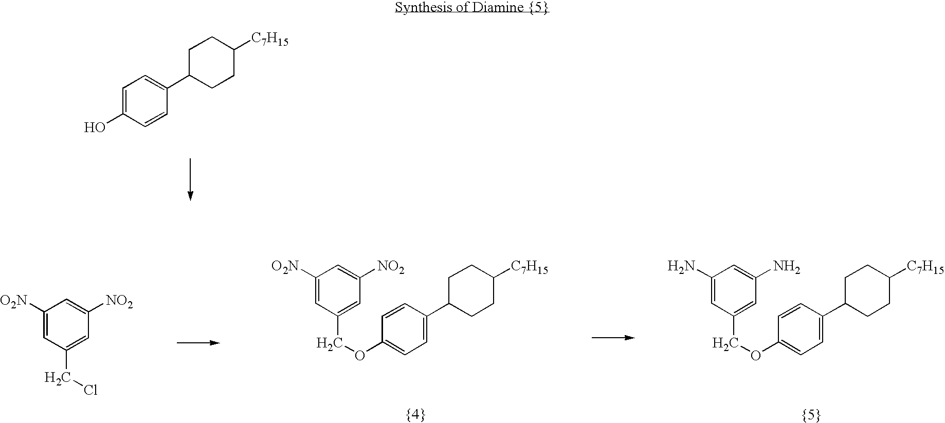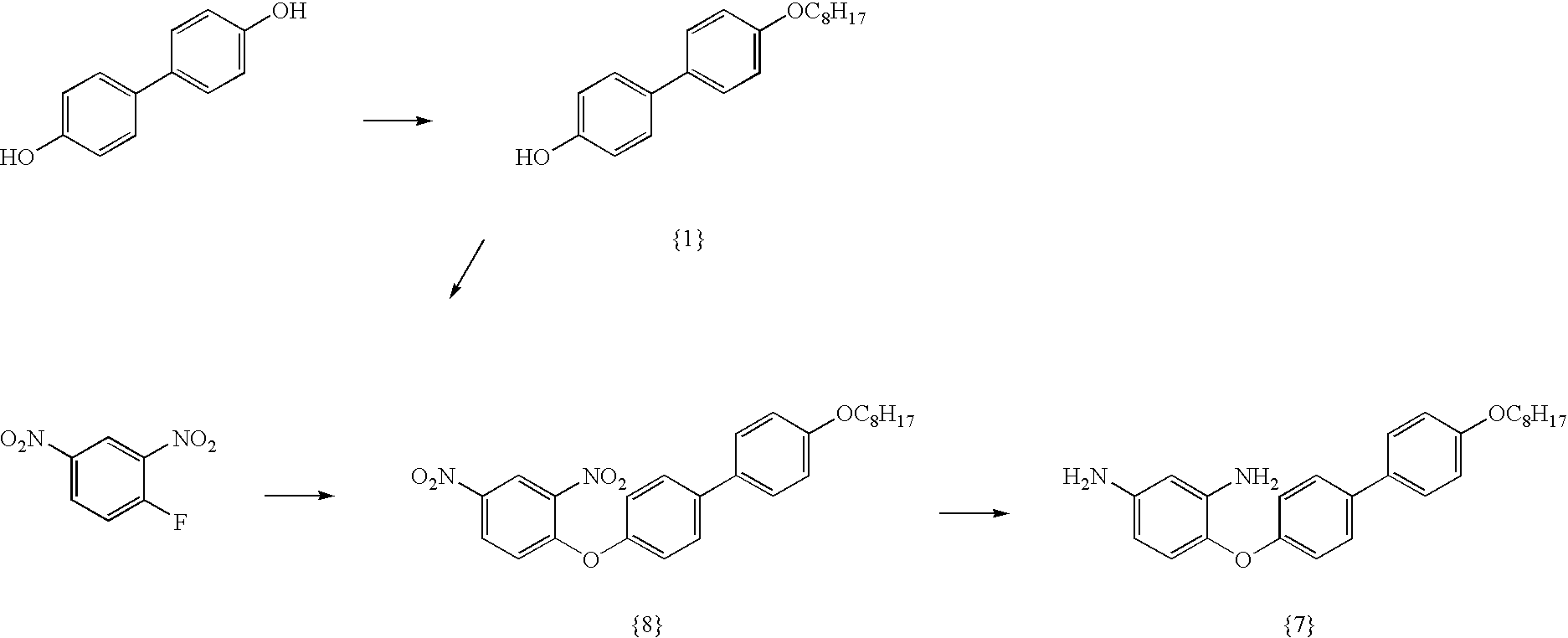 Into a 1,000 ml four necked flask, 2,4-dinitrofluorobenzene (42.06 g, 0.226 mol), {1} (56.20 g, 0.188 mol), potassium carbonate (52.00 g, 0.376 mol) and N,N-dimethylformamide (DMF) (400 ml) were put and stirred at a reaction temperature of 110° C. for 6 hours. After completion of the reaction, potassium carbonate was removed by filtration, and the filtrate was distilled under reduced pressure. Then, methanol was added to the residue to precipitate an yellow solid. The obtained solid was recrystallized from THF to obtain slightly yellow crystals {8} (65.33 g, 75%, mp: 127 to 129° C.). 1H-NMR (CDCl3, δppm): 8.84 (1H,s), 8.31 (1H,d), 7.63 (2H,d), 7.50 (2H,d), 7.17 (2H,d), 7.10 (1H,d), 6.98 (2H,d), 4.00 (2H,t), 1.81 (2H,m), 1.48 (2H,m), 1.31 (8H,m), 0.89 (3H,t) Into a 1,000 ml four necked flask, {8} (35.45 g, 75.35 mmol) and dioxane (400 ml) were put, the reactor was flushed with nitrogen, and then Pd—C (3.55 g) was added thereto. Then, the interior of the reactor was changed to a hydrogen atmosphere, followed by stirring at 60° C. for 50 hours and at room temperature for 120 hours. After completion of the reaction, Pd—C was removed by filtration, and the filtrate was distilled under reduced pressure. The residue was recrystallized from acetonitrile to obtain the diamine {7} (23.55 g, 77%, mp: 196 to 198° C.) as slightly reddish brown crystals. 1H-NMR (CDCl3, δppm): 7.41 to 7.45 (4H,m), 6.96 (2H,d), 6.93 (2H,d), 6.77 (1H,d), 6.18 (1H,s), 6.10 (1H,d), 3.98 (2H,t), 3.54 to 3.70 (4H,broad), 1.79 (2H,m), 1.46 (2H,m), 1.31 (8H,m), 0.89 (3H,t). Using the diamine {7}, a synthesis of a polyimide precursor [E] was carried out. Using the diamine {7} (2.53 g, 6.25 mmol), 1,4-diaminobenzene (2.03 g, 18.77 mmol), 3,4-dicarboxy-1,2,3,4-tetrahydro-1-naphthalene succinic dianhydride (7.51 g, 25.01 mmol) and NMP (48.28 g), a polycondensation reaction was carried out by stirring at room temperature to obtain a polyimide precursor solution [E] having a solid content concentration of 20 wt %. The viscosity of this solution was 435 mPa·s (25° C.: by E model viscometer), and the weight average molecular weight as measured by GPC method was 44,800. Using the polyimide precursor solution [E] thus obtained, treating agents for liquid crystal alignment were produced by the same methods as in Examples 6, 7 and 8, and liquid crystal cells were prepared, whereupon the pretilt angles were measured. The results are shown in Table 2 given below.