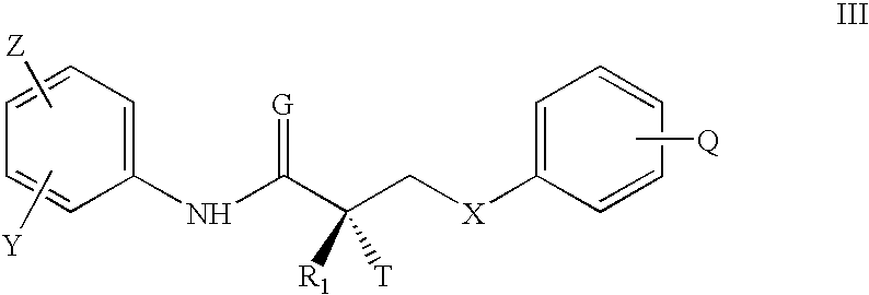 In another embodiment, the composition will comprise a 5-alpha reductase inhibitor and a SARM compound, which is an an analog, derivative, isomer, metabolite, pharmaceutically acceptable salt, pharmaceutical product, hydrate or N-oxide of the compound of formula II, or any combination thereof. In one embodiment, G the compound of formula II is O. In another embodiment, X in the compound of formula II is O. In another embodiment, T in the compound of formula II is OH. In another embodiment, R1 in the compound of formula II is CH3. In another embodiment, Z in the compound of formula II is NO2. In another embodiment, Z in the compound of formula II is CN. In another embodiment, Y in the compound of formula II is CF3. In another embodiment, Q1 in the compound of formula II is NCS. In another embodiment, Q1 in the compound of formula II is in the para position. In another embodiment, Z in the compound of formula II is in the para position. In another embodiment, Y in the compound of formula II is in the meta position. In another embodiment, G in the compound of formula II is O, T is OH, R1 is CH3, X is O, Z is NO2, Y is CF3, and Q1 is NCS. In another embodiment, the present invention provides a composition comprising a 5-alpha reductase inhibitor and a selective androgen receptor modulator (SARM) compound represented by the structure of formula III: