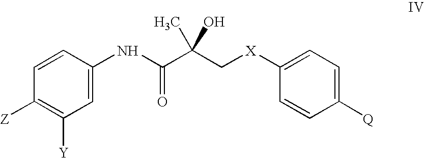 In another embodiment, the composition will comprise a 5-alpha reductase inhibitor and a SARM compound, which is an analog, derivative, isomer, metabolite, pharmaceutically acceptable salt, pharmaceutical product, hydrate or N-oxide of the compound of formula III, or any combination thereof. In one embodiment, G in the compound of formula III is O. In another embodiment, X in the compound of formula III is O. In another embodiment, T in the compound of formula III is OH. In another embodiment, R1 in the compound of formula III is CH3. In another embodiment, Z in the compound of formula III is NO2. In another embodiment, Z in the compound of formula III is CN. In another embodiment, Y in the compound of formula III is CF3. In another embodiment, Q in the compound of formula III is NCS. In another embodiment, Q in the compound of formula III is in the para position. In another embodiment, Z in the compound of formula III is in the para position. In another embodiment, Y in the compound of formula III is in the meta position. In another embodiment, G in the compound of formula III is O, T is OH, R1 is CH3, X is O, Z is NO2, Y is CF3, and Q is NCS. In another embodiment, the present invention provides a composition comprising a 5-alpha reductase inhibitor and a selective androgen receptor modulator (SARM) compound represented by the structure of formula IV: