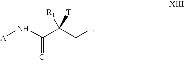 wherein A, G, R1 and T are as defined above and L is a leaving group, with a compound of formula HX-B wherein B and X are as defined above. In one embodiment, the coupling step is carried out in the presence of a base. In another embodiment, the leaving group L is Br. In another embodiment, the compound of formula XIII is prepared by