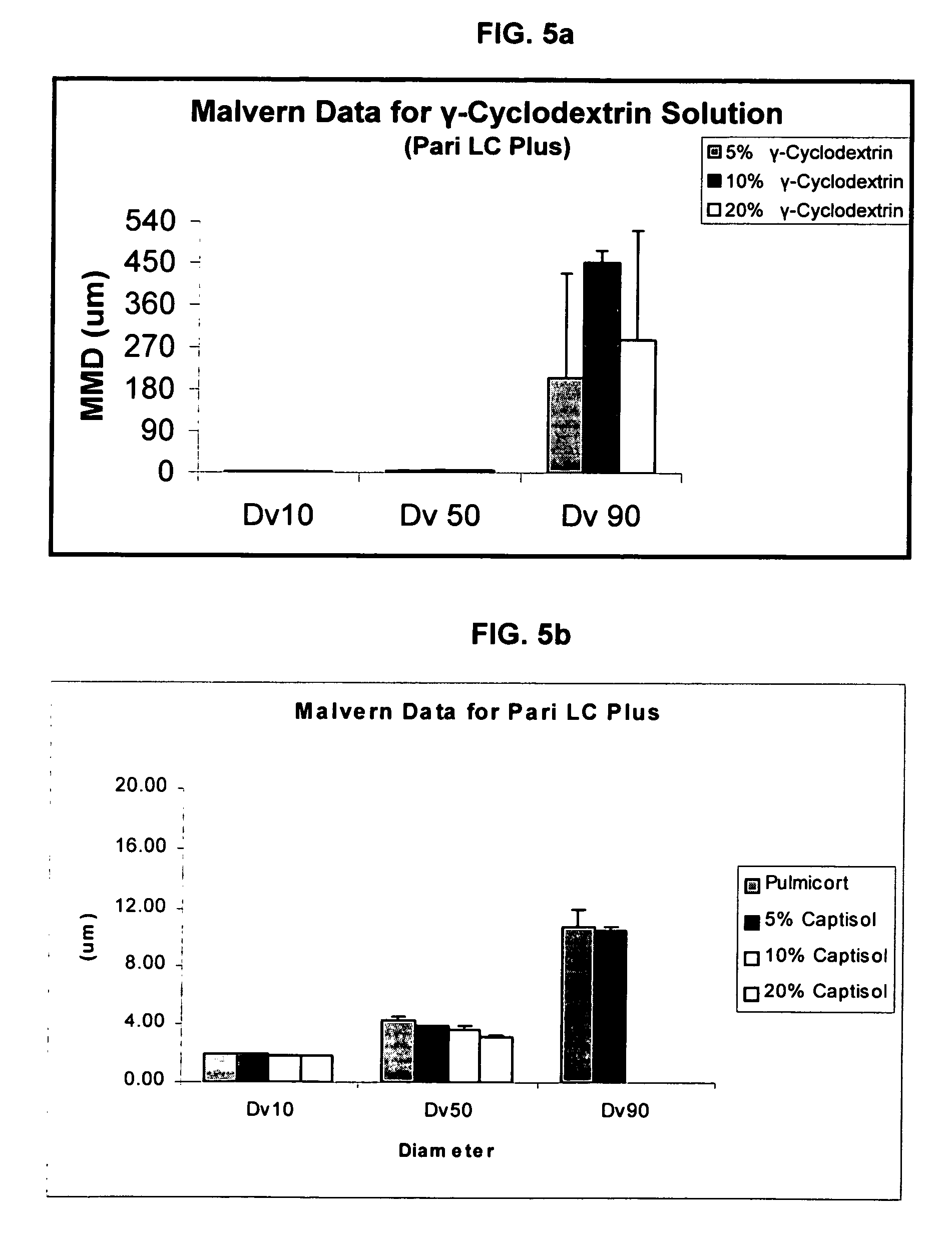 Two ml of the test CD solution or Pulmicort suspension was accurately pipetted by volumetric pipettes into a clean nebulizer cup prior to starting each experiment. The test nebulizer was assembled and charged with the test inhalation solution or suspension according to the manufacturer instructions. The end of the mouthpiece was placed at a height of approximately 18 cm from the platform of the MALVERN MASTERSIZER to the middle point of tip of the nebulizer mouthpiece. A vacuum source was positioned opposite the mouthpiece approximately 6 cm away to scavenge aerosol after sizing. The distance between the mouthpiece and the detector was approximately 8 cm. The center of the mouthpiece was level with the laser beam (or adjusted as appropriate, depending on the individual design of each nebulizer). The laser passed through the center of the emitted cloud when the nebulizer was running. Measurements were manually started 15 seconds into nebulization. Data collection started when beam obscuration reached 10% and was averaged over 15,000 sweeps (30 seconds). Scatted light intensity data on the detector rings was modeled using the “Standard-Wet” model. Channels 1 and 2 were killed due to low relative humidity during measurement to prevent beam steering. The volume diameter of droplets defining 10, 50 (volume median), and 90% of the cumulative volume undersize was determined. (Dv10 is the size below which 10% of the volume of material exists, Dv50 is the size below which 50% of the volume of material exists and Dv90 is the size below which 90% of the volume of material exists.