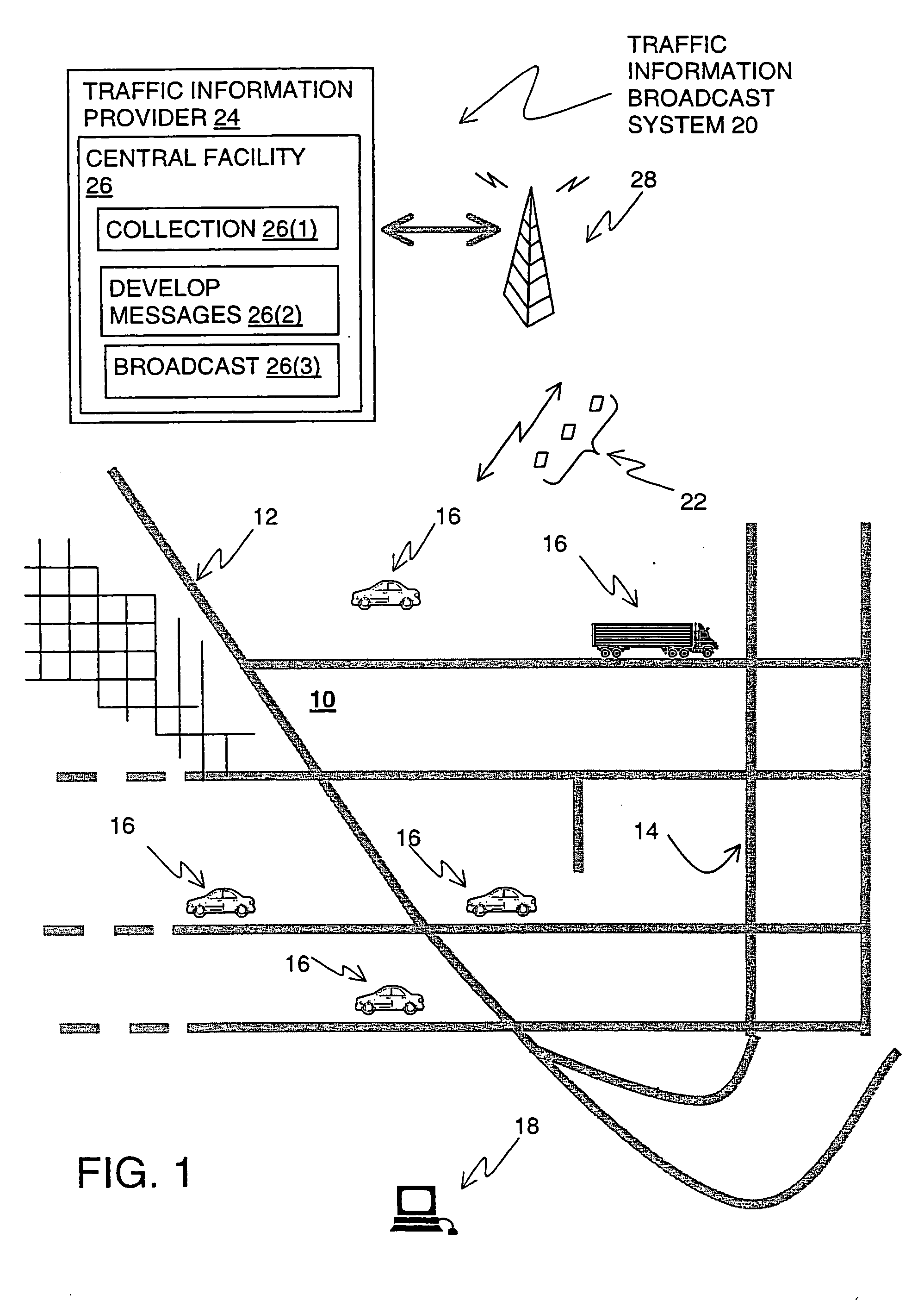 defining a plurality of broadcast service areas in a geographic region, wherein each of said broadcast service areas being associated with a broadcast service area code, wherein a single transmission equipment is capable of transmitting to more than one of said broadcast service areas; obtaining data indicating a plurality of traffic conditions on a road network in the geographic region, for each of said traffic conditions said data provides a location description; for each of said traffic conditions, using said location description to identify said broadcast service area in which said traffic condition is located, said broadcast service area associated with a broadcast service area code; and transmitting a plurality of traffic messages representing said traffic conditions, each of said messages being associated with said corresponding identified broadcast service area code. 12. The method of 13. The method of 14. The method of an end user computing platform receiving said traffic messages; and filtering said traffic messages to process only said traffic messages having said broadcast service area code matching at least one predetermined broadcast service area. 15. The method of 16. The method of 17. The method of 18. The method of 19. A traffic message providing data indicating a traffic condition on a road network in a geographic region, said traffic message comprising: