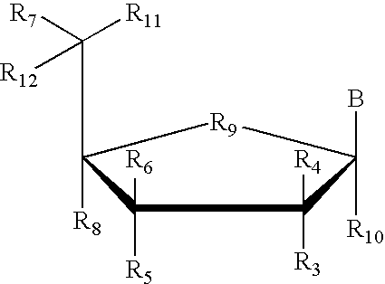 wherein for example each R3, R4, R5, R6, R7, R8, R10, R11, R12, and R13 is independently H, OH, alkyl, substituted alkyl, alkaryl or aralkyl, F, Cl, Br, CN, CF3, OCF3, OCN, O-alkyl, S-alkyl, N-alkyl, O-alkenyl, S-alkenyl, N-alkenyl, SO-alkyl, alkyl-OSH, alkyl-OH, O-alkyl-OH, O-alkyl-SH, S-alkyl-OH, S-alkyl-SH, alkyl-S-alkyl, alkyl-O-alkyl, ONO2, NO2, N3, NH2, aminoalkyl, aminoacid, aminoacyl, ONH2, O-aminoalkyl, O-aminoacid, O-aminoacyl, heterocycloalkyl, heterocycloalkaryl, aminoalkylamino, polyalklylamino, substituted silyl, or group having Formula I; R9 is O, S, CH2, S═O, CHF, or CF2.
