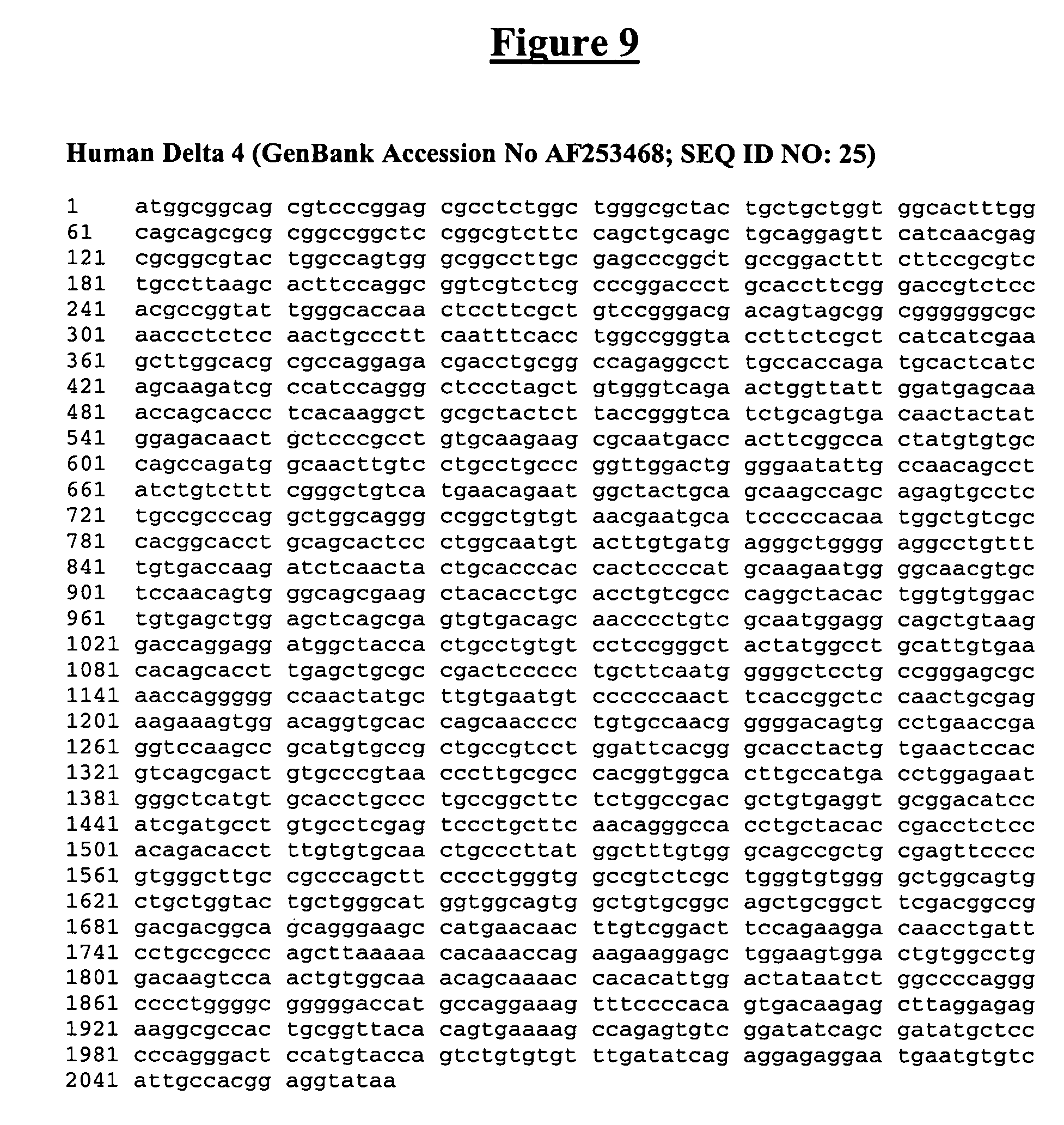 The region between the 5th and 6th cysteine contains two conserved glycines of which at least one is normally present in most EGF-like domains. The EGF-like domain used may be derived from any suitable species, including for example It will be appreciated that the term “EGF domain” as used herein includes sequence variants, fragments, derivatives and mimetics having activity corresponding to naturally occurring domains. Suitably, for example, an EGF-like domain for use in the present invention may have at least 30%, preferably at least 50%, preferably at least 60%, preferably at least 70%, preferably at least 80%, preferably at least 90%, preferably at least 95% amino acid sequence identity to an EGF-like domain of human Jagged 1. Alternatively an EGF-like domain for use in the present invention may, for example, have at least 30%, preferably at least 50%, preferably at least 60%, preferably at least 70%, preferably at least 80%, preferably at least 90%, preferably at least 95% amino acid sequence identity to an EGF-like domain of human Jagged 2. Alternatively an EGF-like domain for use in the present invention may, for example, have at least 30%, preferably at least 50%, preferably at least 60%, preferably at least 70%, preferably at least 80%, preferably at least 90%, preferably at least 95% amino acid sequence identity to an EGF-like domain of human Delta 1. Alternatively an EGF-like domain for use in the present invention may, for example, have at least 30%, preferably at least 50%, preferably at least 60%, preferably at least 70%, preferably at least 80%, preferably at least 90%, preferably at least 95% amino acid sequence identity to an EGF-like domain of human Delta 3. Alternatively an EGF-like domain for use in the present invention may, for example, have at least 30%, preferably at least 50%, preferably at least 60%, preferably at least 70%, preferably at least 80%, preferably at least 90%, preferably at least 95% amino acid sequence identity to an EGF-like domain of human Delta 4. As a practical matter, whether any particular amino acid sequence is at least X % identical to another sequence can be determined conventionally using known computer programs. For example, the best overall match between a query sequence and a subject sequence, also referred to as a global sequence alignment, can be determined using a program such as the FASTDB computer program based on the algorithm of Brutlag et al. (Comp. App. Biosci. (1990) 6:237-245). In a sequence alignment the query and subject sequences are either both nucleotide sequences or both amino acid sequences. The result of the global sequence alignment is given as percent identity. The term “Notch ligand N-terminal domain” means the part of a Notch ligand sequence from the N-terminus to the start of the DSL domain. It will be appreciated that this term includes sequence variants, fragments, derivatives and mimetics having activity corresponding to naturally occurring domains. The term “heterologous amino acid sequence” or “heterologous nucleotide sequence” as used herein means a sequence which is not found in the native Notch ligand or its coding sequence. Whether an agent can be used for activating or reducing Notch signalling may be determined using suitable screening assays, for example, as described in the examples herein. Activation of Notch signalling may also be achieved by repressing inhibitors of the Notch signalling pathway. As such, polypeptides for Notch signalling activation will include molecules capable of repressing any Notch signalling inhibitors. Preferably the molecule will be a polypeptide, or a polynucleotide encoding such a polypeptide, that decreases or interferes with the production or activity of compounds that are capable of producing an decrease in the expression or activity of Notch, Notch ligands, or any downstream components of the Notch signalling pathway. In a preferred embodiment, the molecules will be capable of repressing polypeptides of the Toll-like receptor protein family and growth factors such as the bone morphogenetic protein (BMP), BMP receptors and activins, derivatives, fragments, variants and homologues thereof. The present invention also relates to modification of Notch-protein expression or presentation on the cell membrane or signalling pathways. Agents that enhance the presentation of a fully functional Notch-protein on the lymphocyte or APC surface include matrix metalloproteinases such as the product of the Kuzbanian gene of In more detail, whether a substance can be used for modulating Notch signalling may be determined using suitable screening assays. Screening assays for the detection of increased Notch, Notch ligand expression and/or processing include: Notch-Notch ligand expression may be assessed following exposure of isolated cells to test compounds in culture using for example: